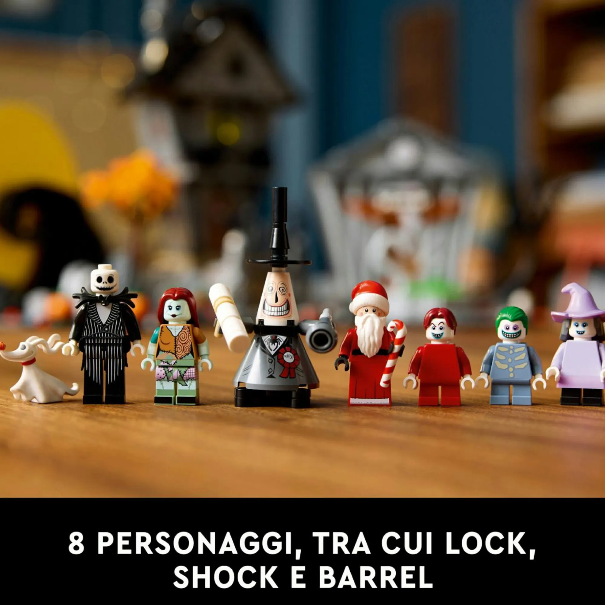 Kit di modellismo con 8 personaggi: sono include le minifigure di Jack Skellington, Sally, Babbo Natale, Vado, Vedo e Prendo LEGO, oltre al cane Zero e il personaggio costruibile del Sindaco a 2 facce