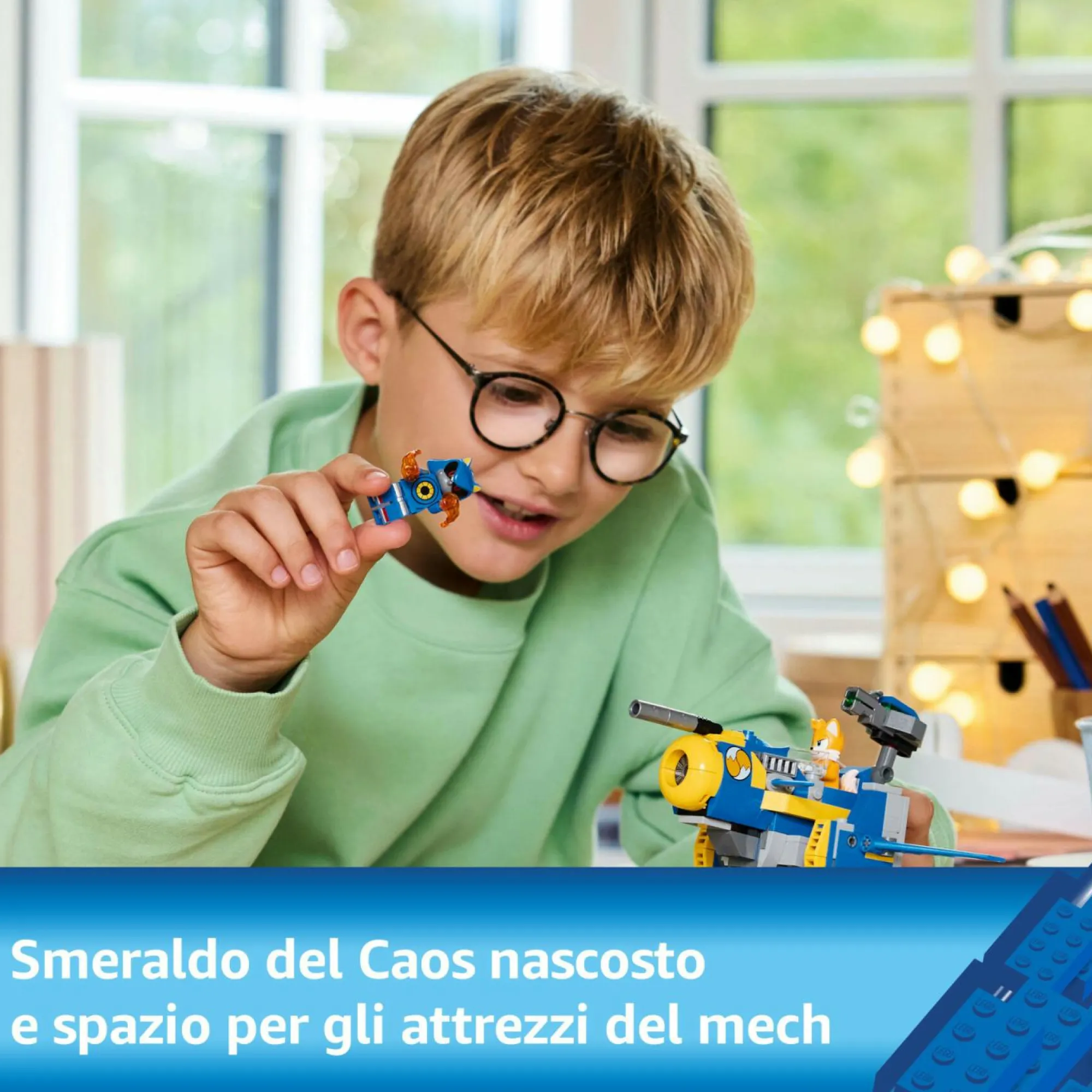 Set di giochi LEGO Sonic da collezione: contiene un mech giocattolo con cabina di pilotaggio, gambe articolate e torretta con shooter, oltre a un Chaos Emerald nascosto, attrezzi per il mech e le minifigure di Metal Sonic e Tails