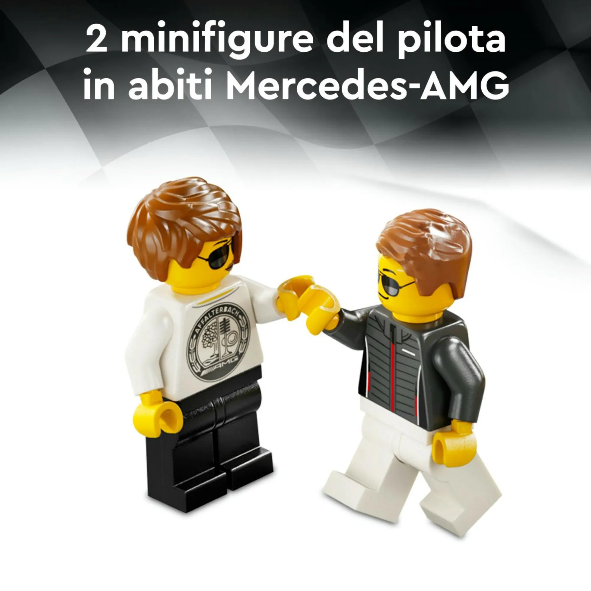 2 minifigure di pilota: ogni veicolo giocattolo include una minifigure del pilota che indossa una tuta Mercedes-AMG, per offrire l’opportunità ai bambini di mettere in scena gare avvincenti con le auto da corsa