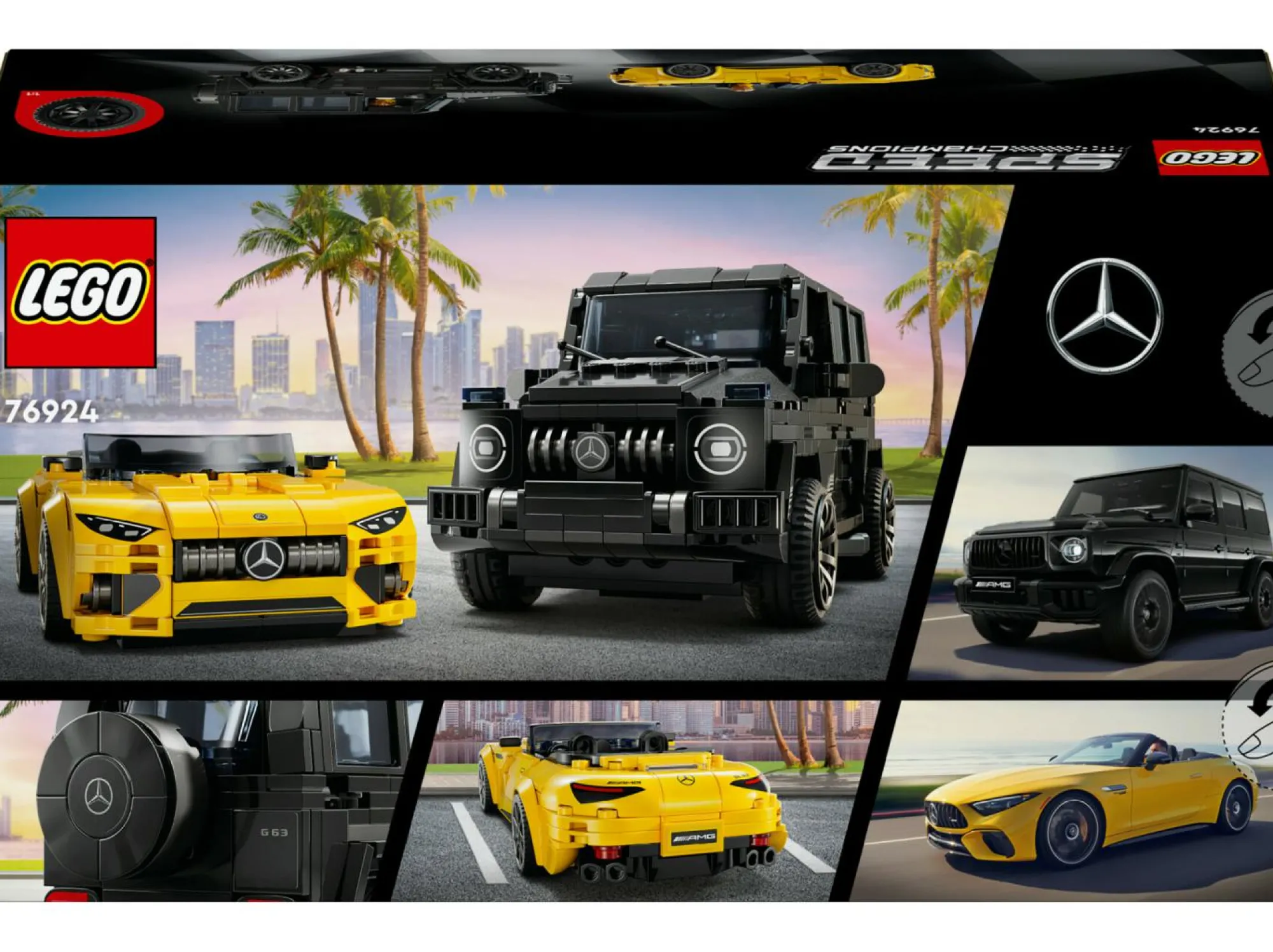 Design macchine Mercedes-AMG originale: i modellini di auto LEGO, il SUV Mercedes-AMG G 63 nero G-class e la roadster Mercedes-AMG SL 63 gialla, offrono dettagli e caratteristiche della famosa livrea Mercedes-AMG con griglie anteriori, cofani e ruote
