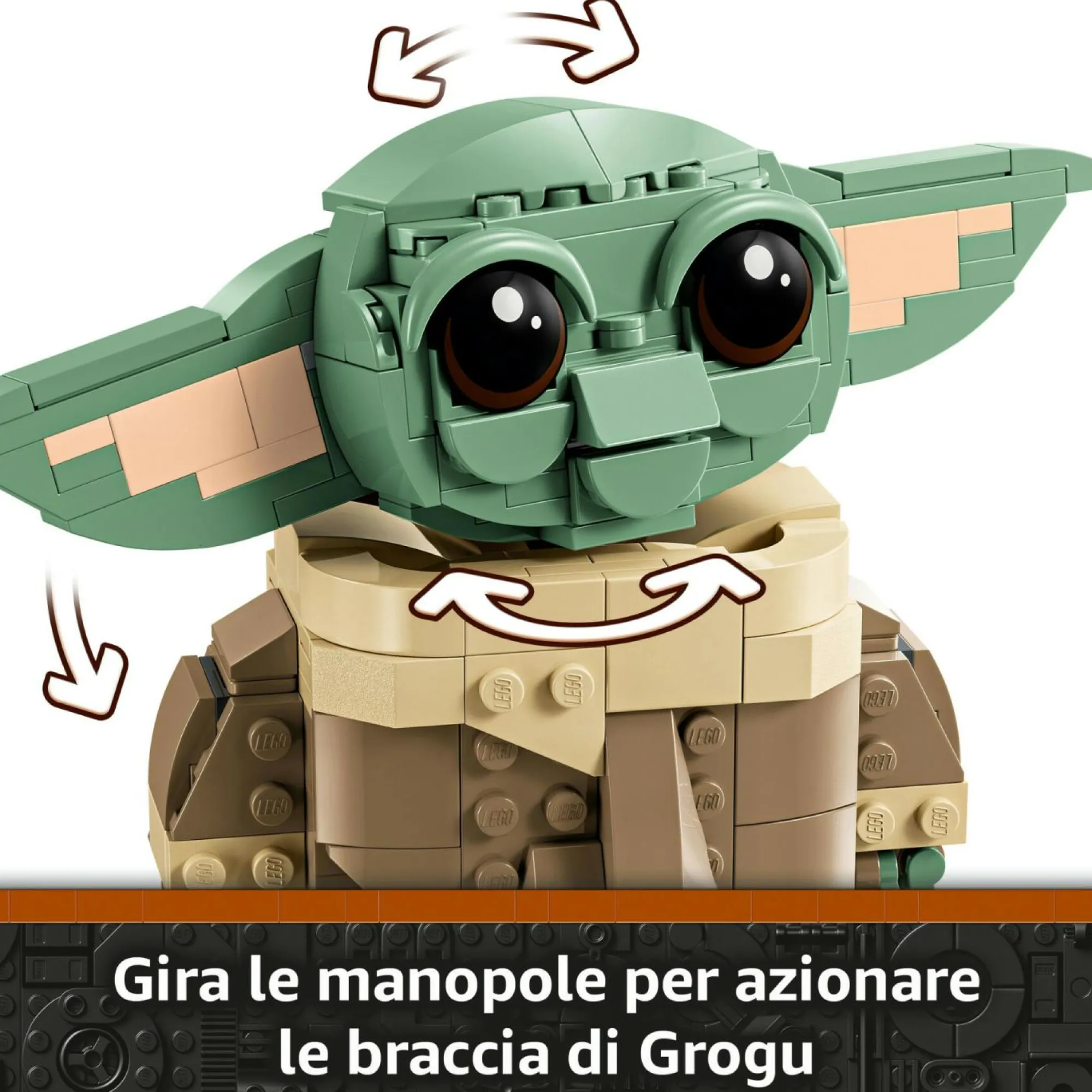 Modello da esposizione ricco di dettagli: il personaggio LEGO Star Wars di Grogu, noto anche come Baby Yoda, è dotato di braccia azionabili tramite manopole e testa e orecchie snodabili e può essere esposto dentro o fuori dal suo passeggino hover