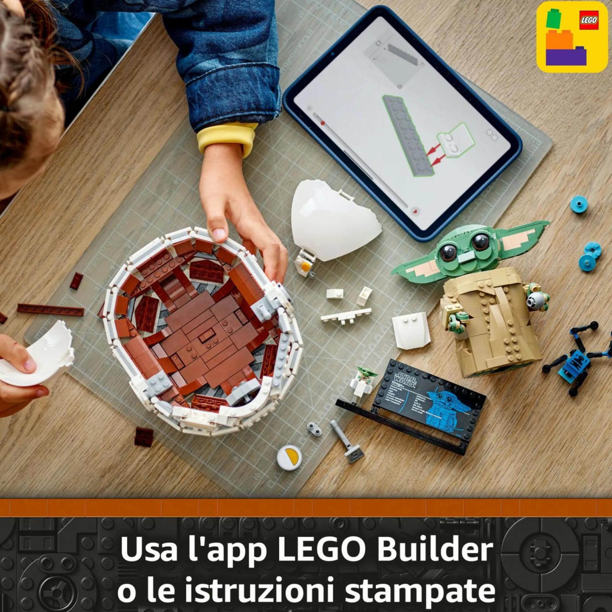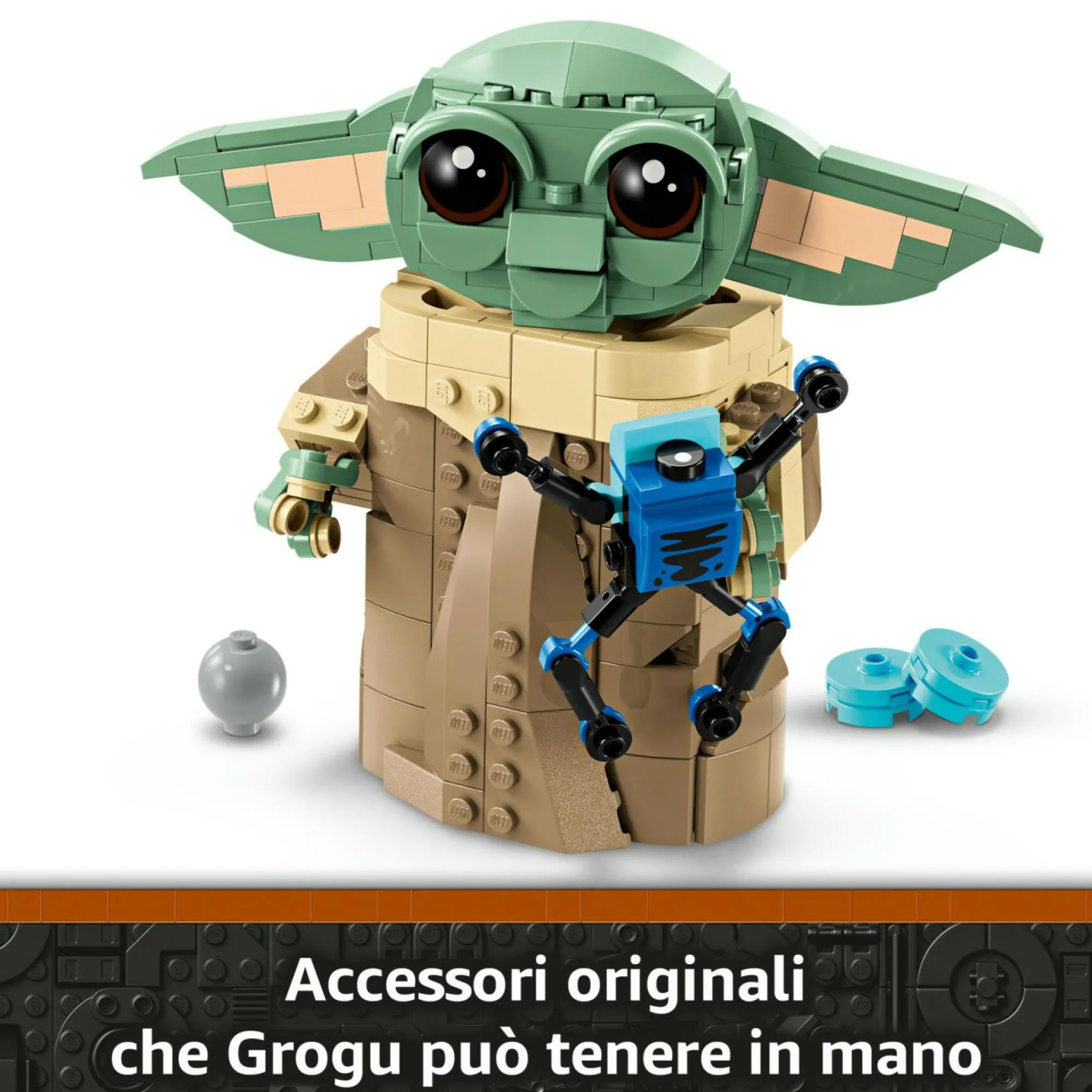 Costruzioni LEGO per bambini con accessori: questo set fantasy include una rana Sorgan in mattoncini LEGO, una manopola del cambio e un biscotto che Grogu può tenere in mano; una simpatica decorazione di casa o per la cameretta dei piccoli