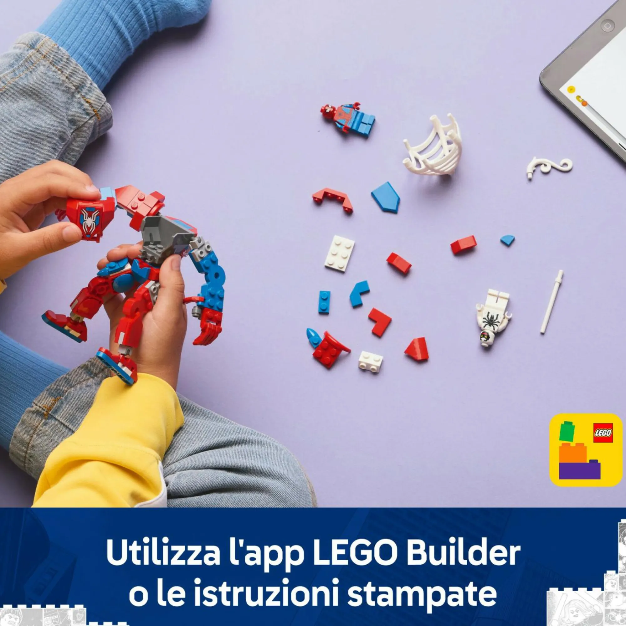 Action figure Marvel costruibile di Spider-Man: il mech LEGO Marvel è dotato di braccia, gambe e dita mobili e il busto si apre per rivelare una cabina di guida che può contenere la minifigure di Spider-Man