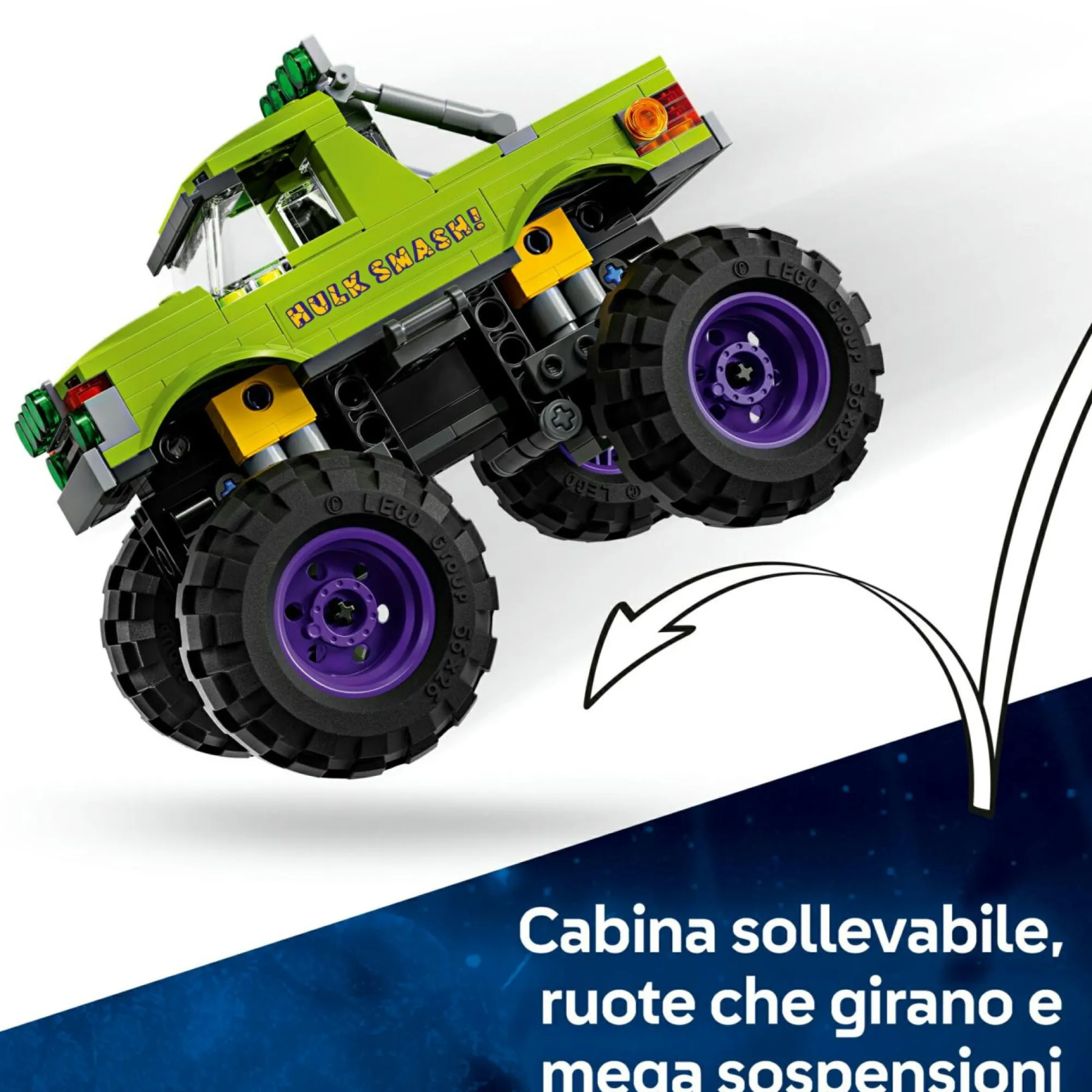 Camion fuoristrada costruibile: il robusto camion LEGO del supereroe è dotato di sedile di guida con spazio per la minifigure di Hulk, e di grandi ruote girevoli con sospensioni ammortizzanti