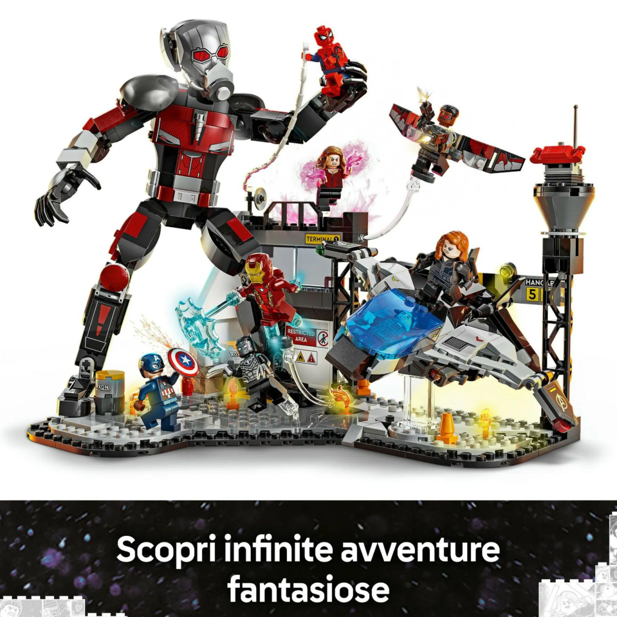 Personaggi Marvel Avengers: include un action figure LEGO di Ant-Man completamente snodabile, e 8 minifigure giocattolo di: Captain America, Soldato d’Inverno, Wanda, Falcon, Iron Man, Spider-Man, Black Widow e Black Panther