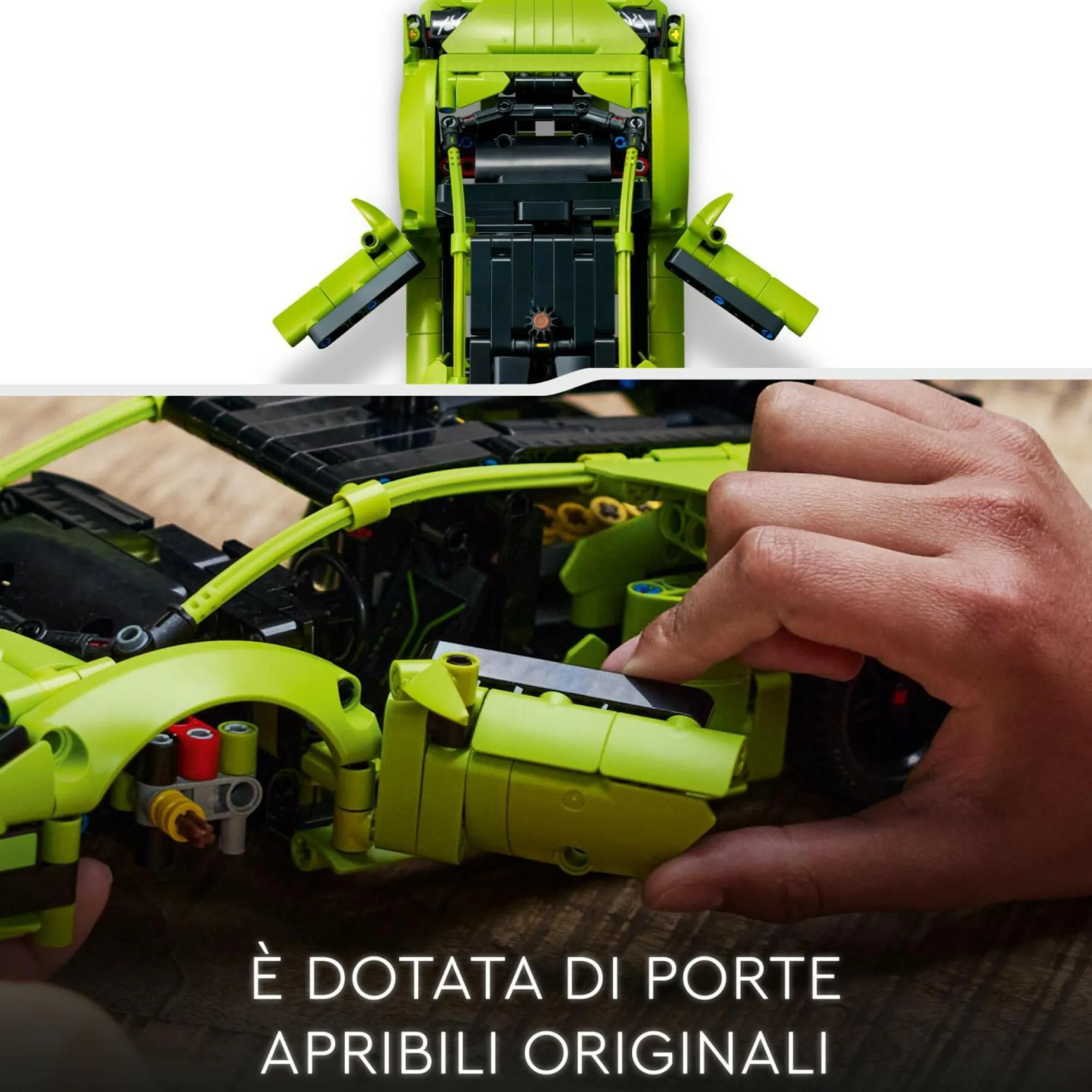 La macchina giocattolo LEGO, ispirata all’originale Lamborghini, presenta l’iconico colore verde, il design aerodinamico e le portiere apribili, che i fan riconosceranno con piacere al primo sguardo