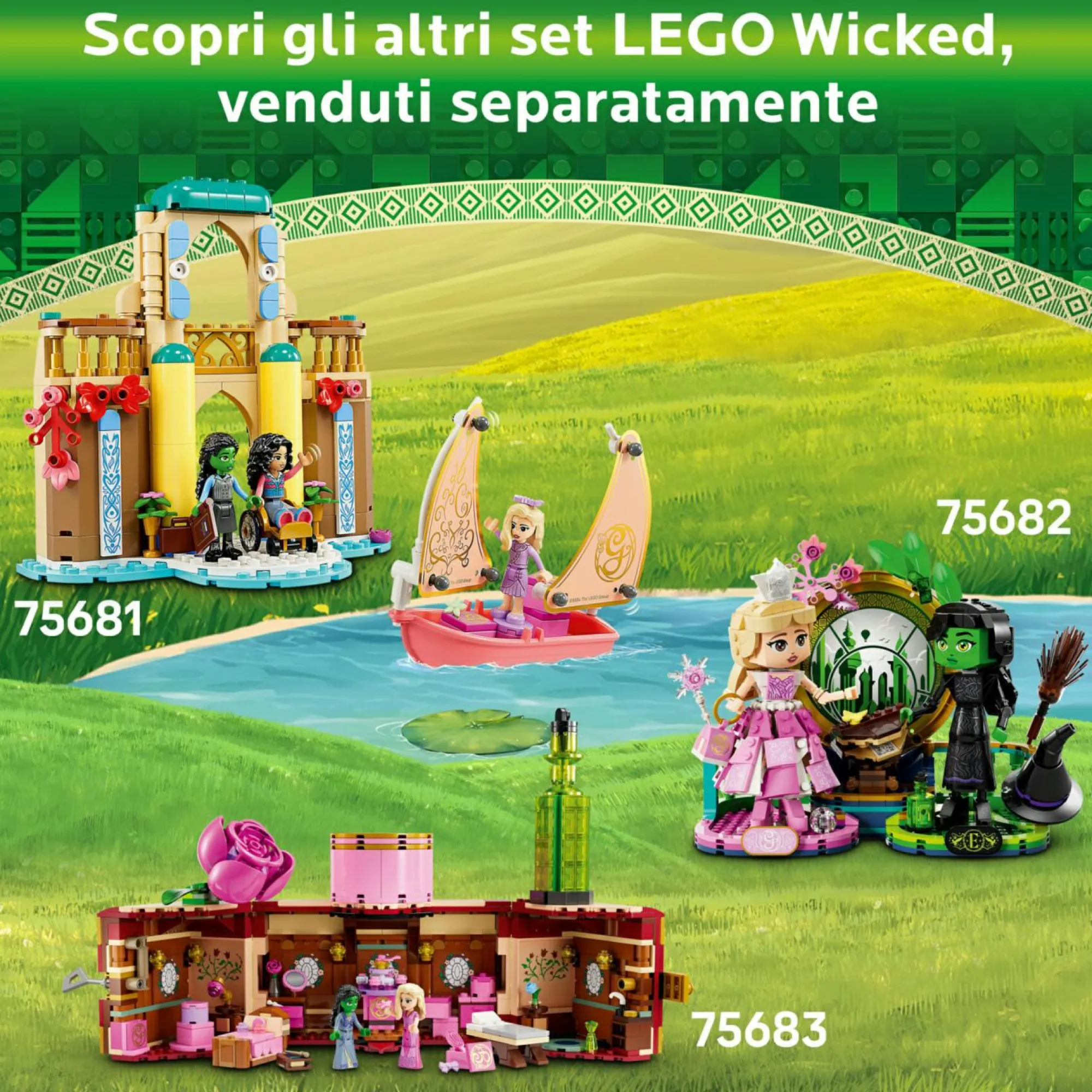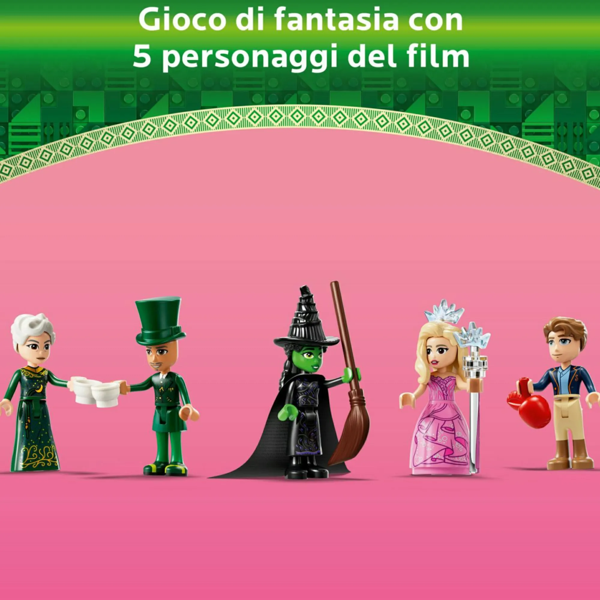 Gioco di fantasia con i personaggi LEGO Wicked: include le mini bamboline di Glinda ed Elphaba, il Mago, Madame Morrible e Fiyero, oltre a una scena della Città di Smeraldo