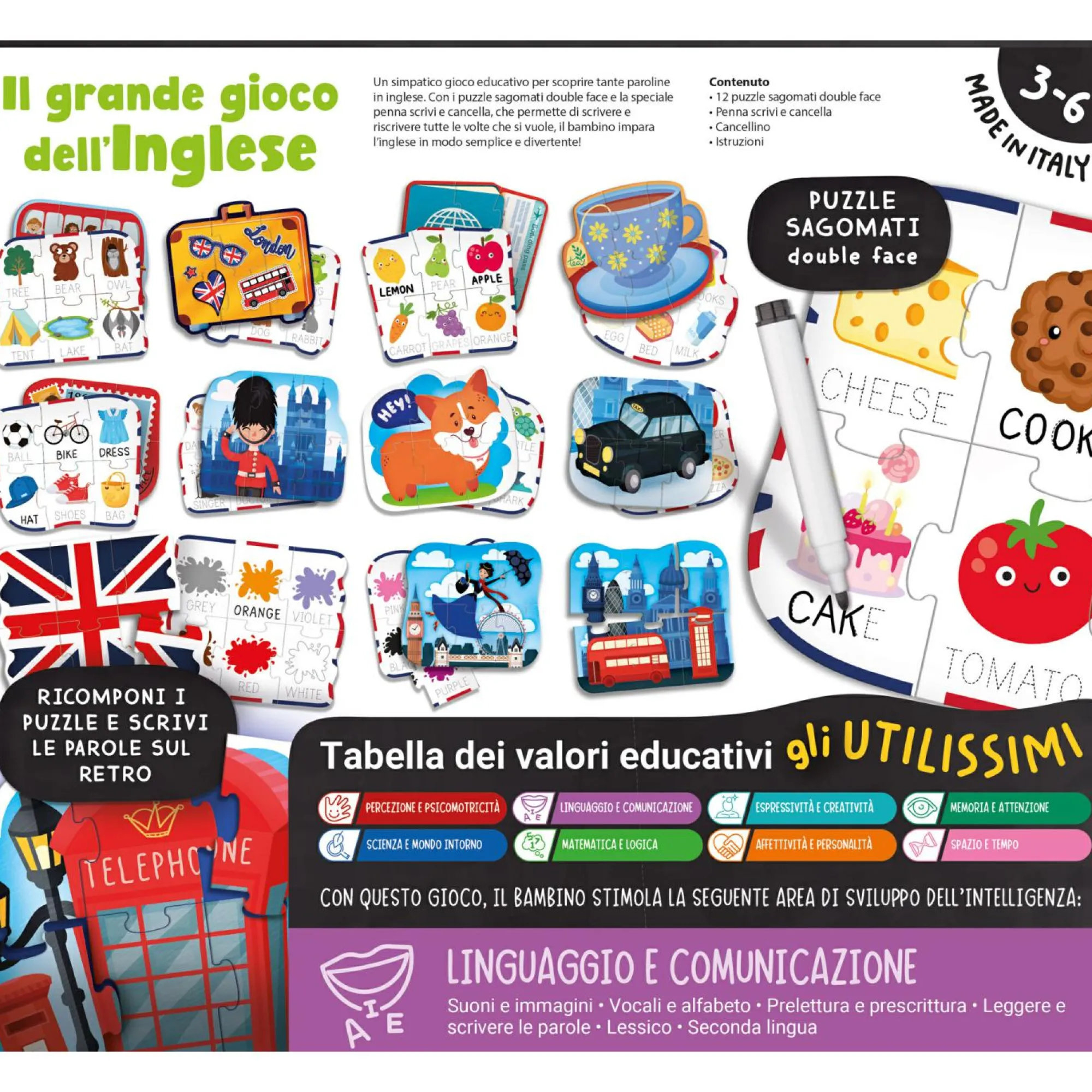 5 puzzle sagomati double face – Penna scrivi e cancella – Cancellino – Istruzioni