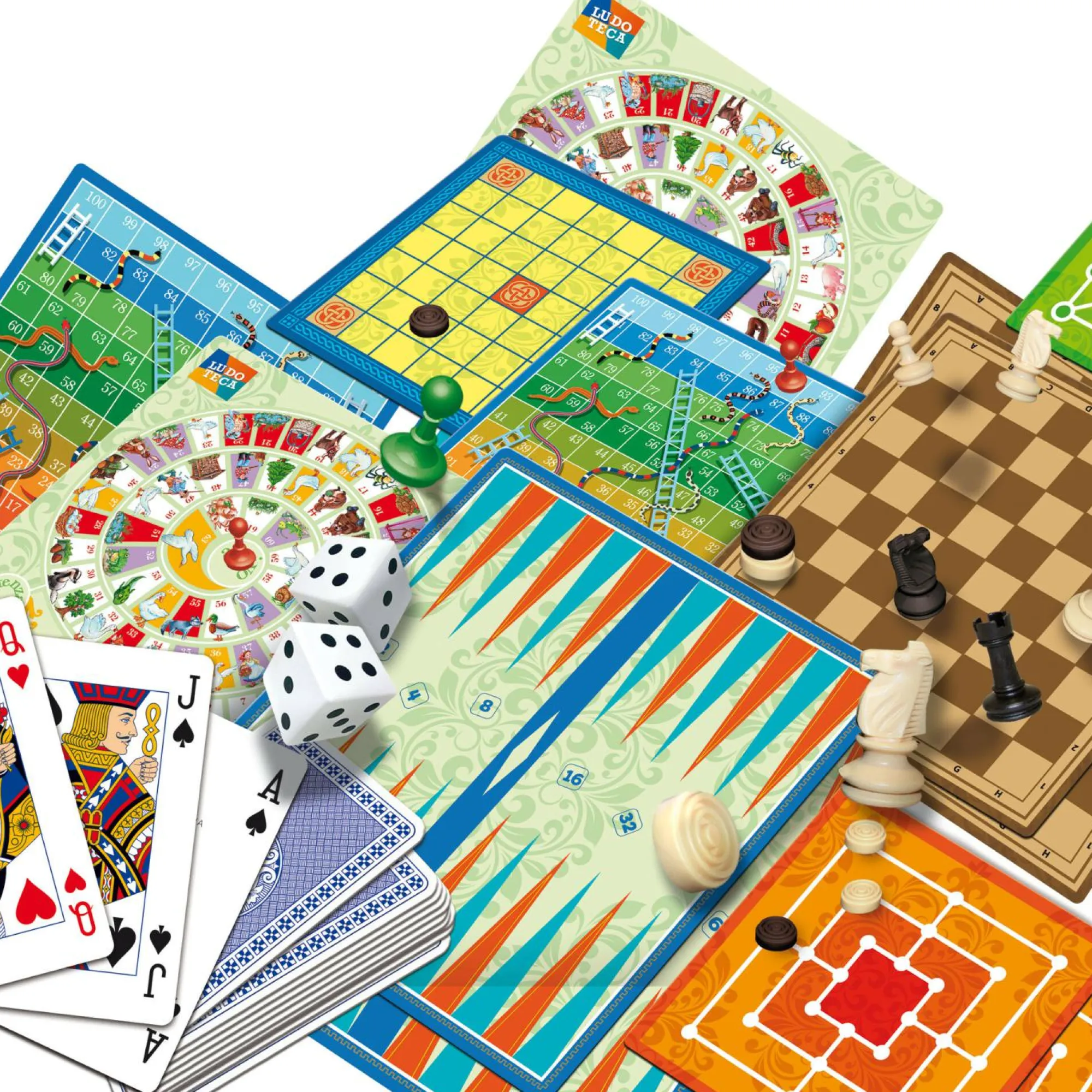 1+ giocatori – Per grandi e piccoli – Manuale dei giochi – Scacchi e pedine della Dama in plastica – Tessere del Domino – Mazzo di carte e dadi da gioco – Giochi di percorso – Giochi di strategia – Giochi di prontezza