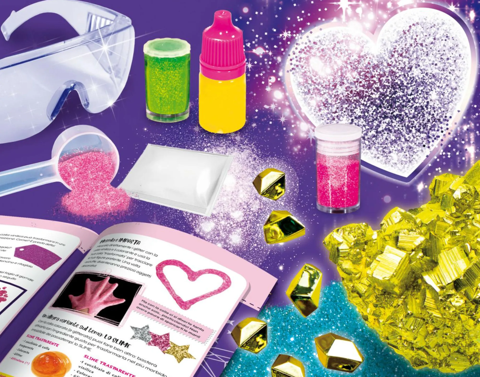 Glitter colorato, pigmento liquido colorato, amido di mais, occhiali protettivi, guanti protettivi, pietre, polvere brilla al buio, misurino di plastica, istruzioni
