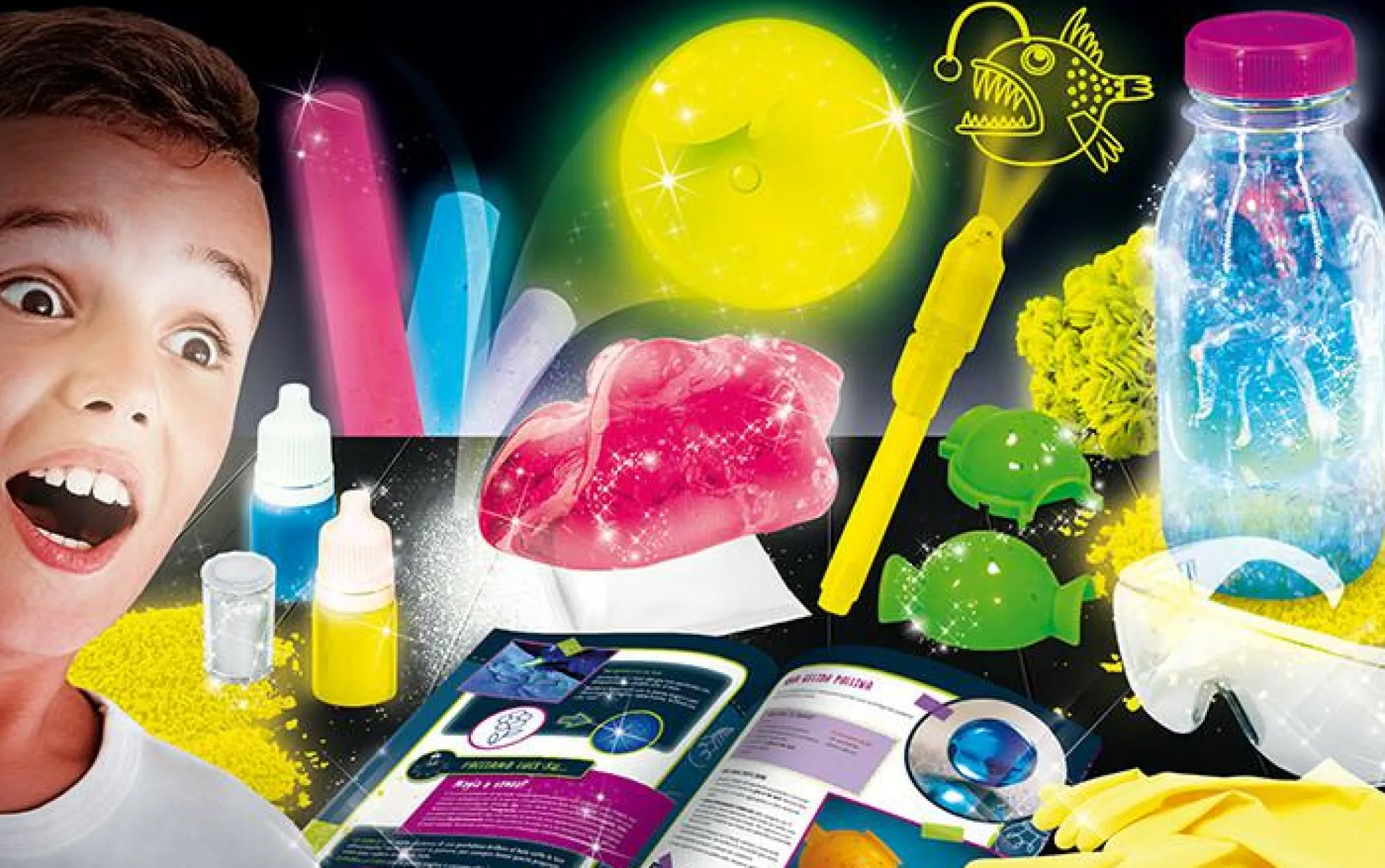 pigmento fosforescente, penna che brilla al buio, gessetti, pigmenti liquidi, cristalli, stampo per palline, guanti, polvere di slime, ricco manuale illustrato