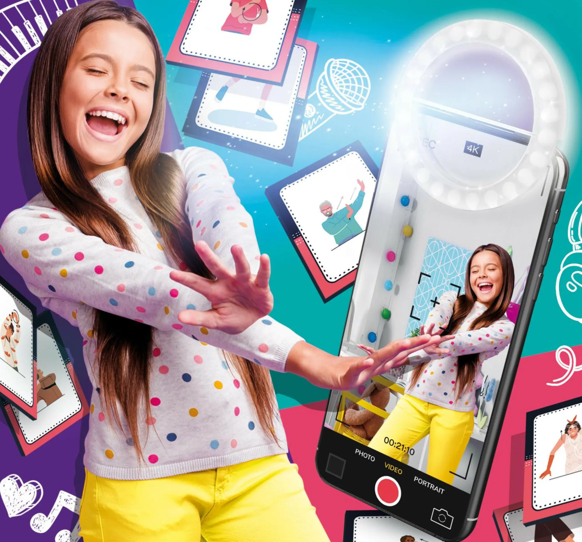 Alla scoperta del mondo del ballo!Usa la RING LIGHT per riprendere al meglio i tuoi balletti!Perfetto per i tuoi canali SOCIAL!Sfida i tuoi amici a colpi di ballo!Con il pratico piedistallo per tenere in posizione il telefono durante la ripresa!