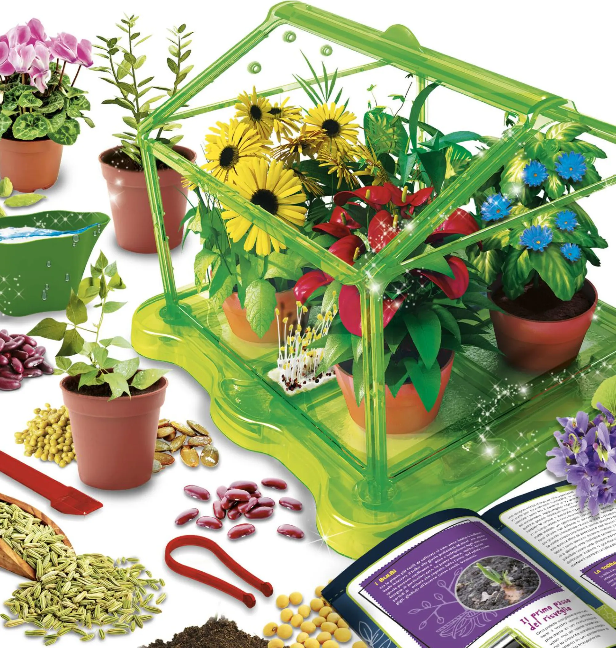 serra da montare, torba, semi biologici, attrezzi per coltivare, vasetti, ricco manuale illustrato