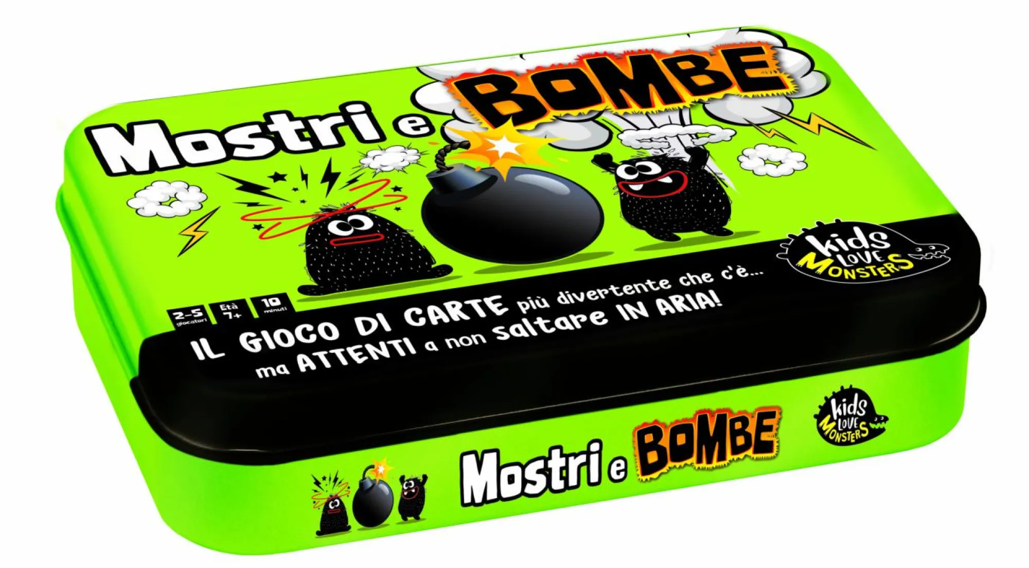 Un gioco di carte che ti terrà col fiato sospeso! – Riuscirai ad evitare le esplosioni? – In un fantastico cofanetto di metallo! – Con il mostriciattolo portafortuna
