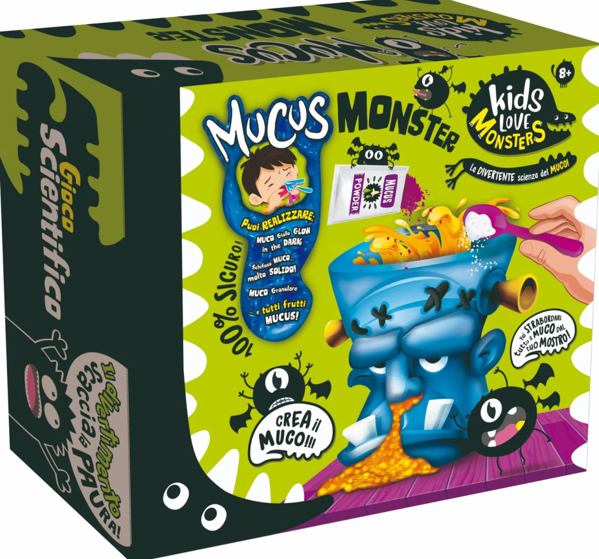 lo slime è obsoleto! È arrivato il tempo del muco! – un grande mostro Frankestein in plastica! – apri la testa del mostro, versa e mescola i reagenti, riposiziona la testa e spingi giù…vedrai montagne di muco colare dal naso del mostro! – con questo kit si possono realizzare innumerevoli tipologie di muco schifoso e colorato!