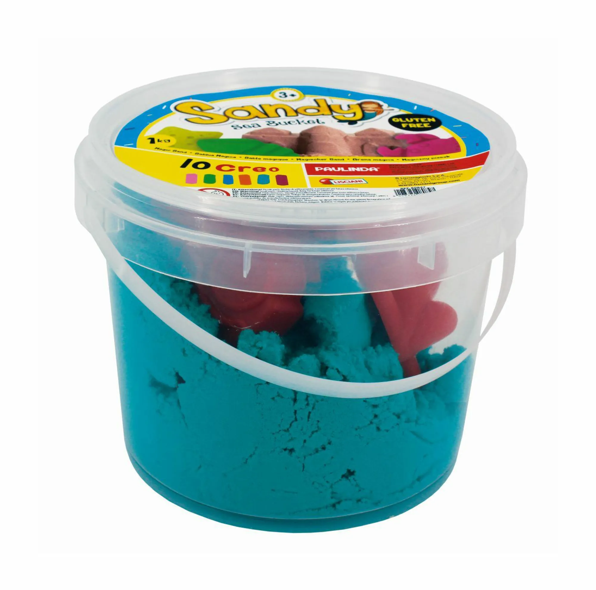 1kg di sabbia magica colorata, secchiello in plastica, 4 formine di plastica