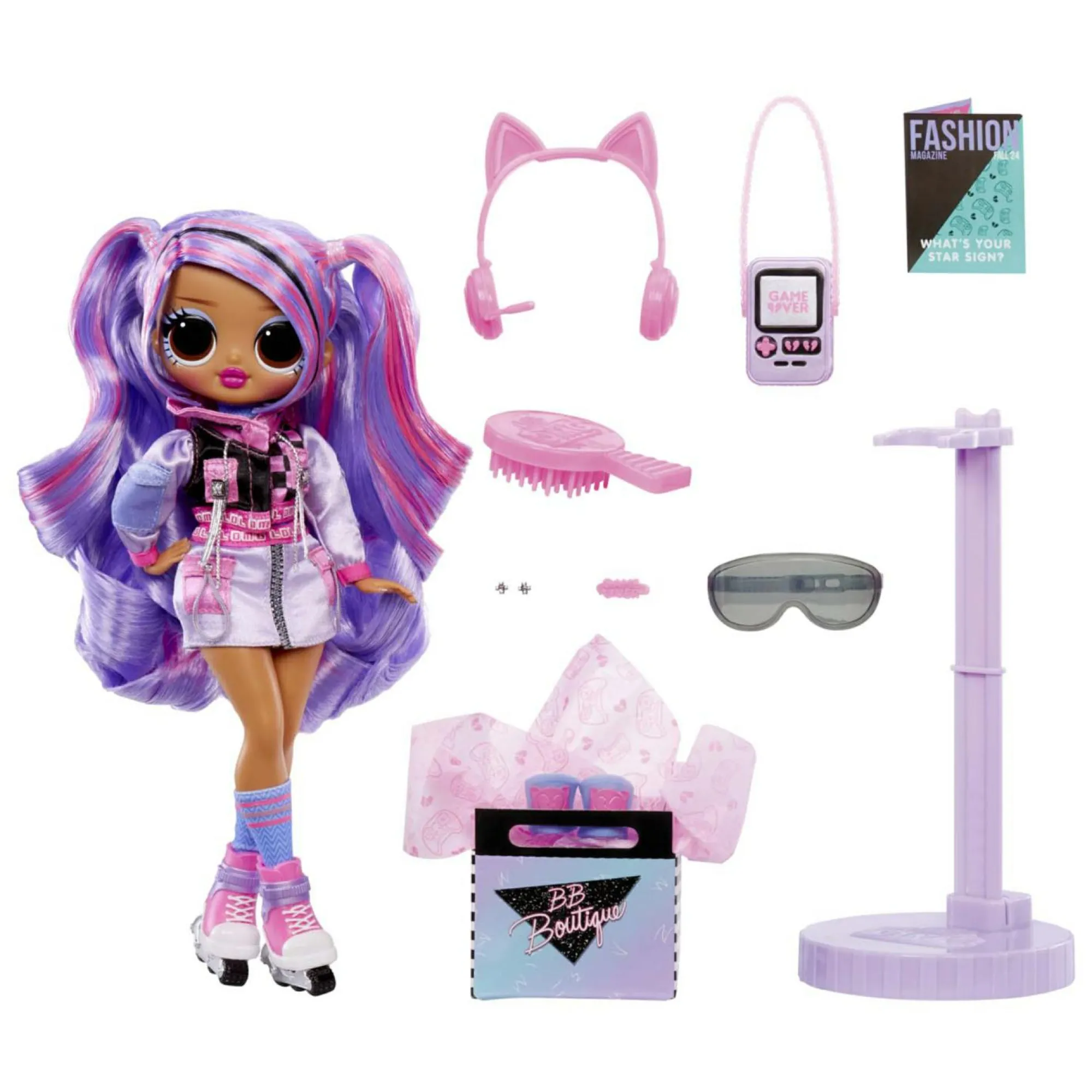 Set completo per bambola: giacca elegante, pattini alla moda, visiera chic, borsa, cuffie da gatto, ginocchiere, orecchini, occhiali, spazzola.