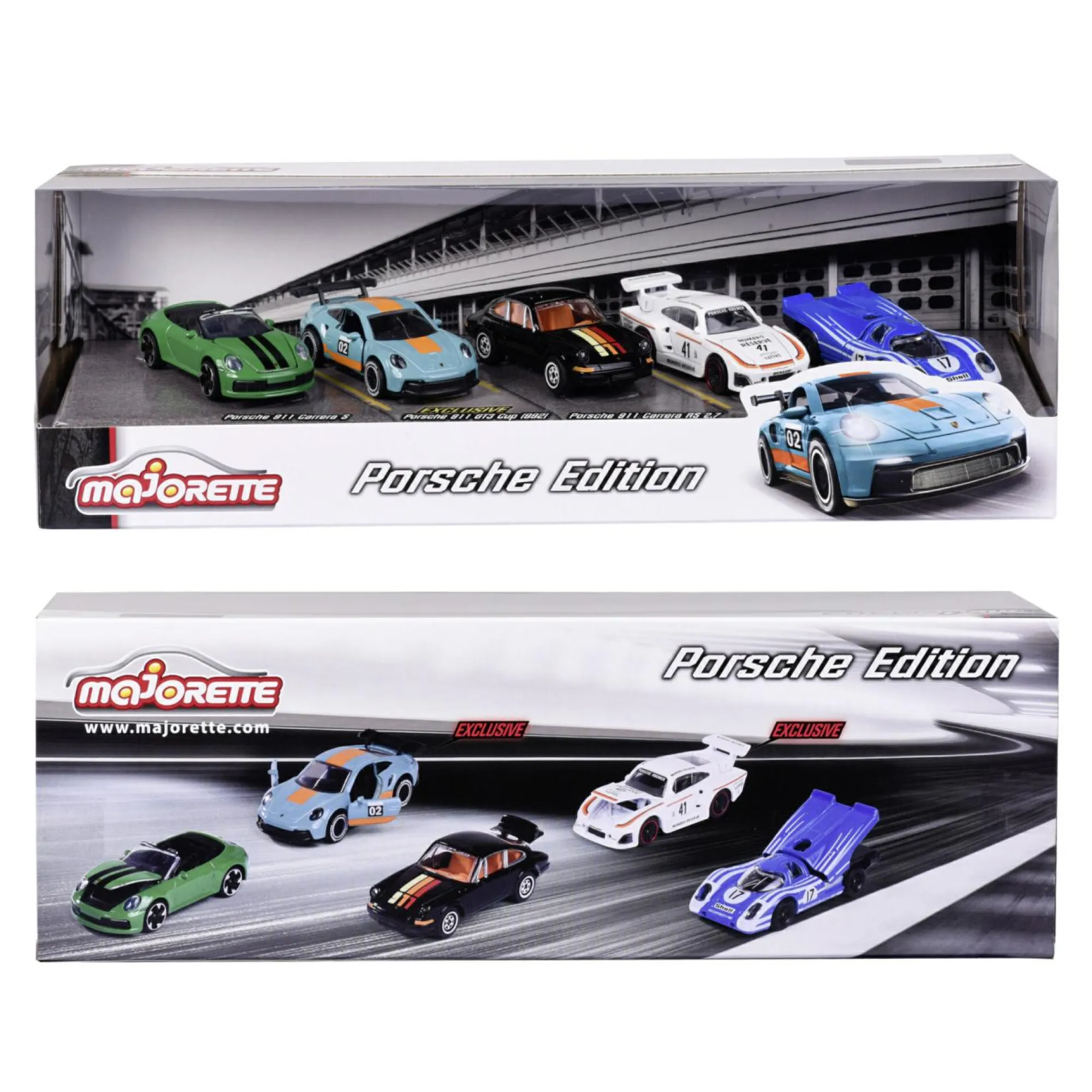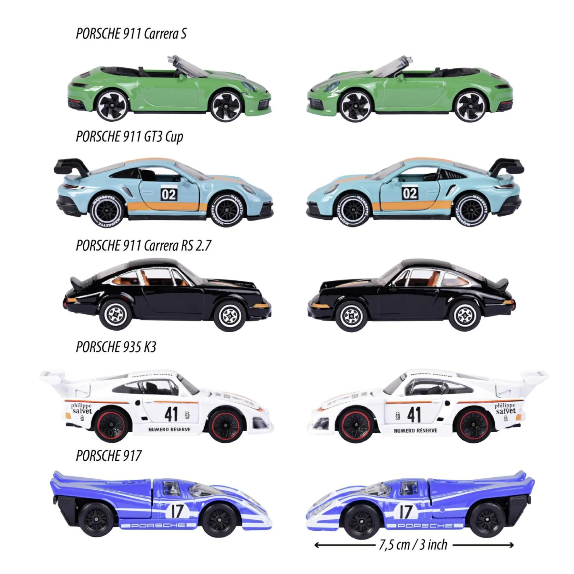 • Porsche 917 blu • Porsche 911 Carrera RS 2.7 nera • Porsche 911 Carrera S Cabriolet verde • Esclusiva: Porsche 935 K3 bianca • Esclusiva: Porsche 911 GT3 Cup (992) blu