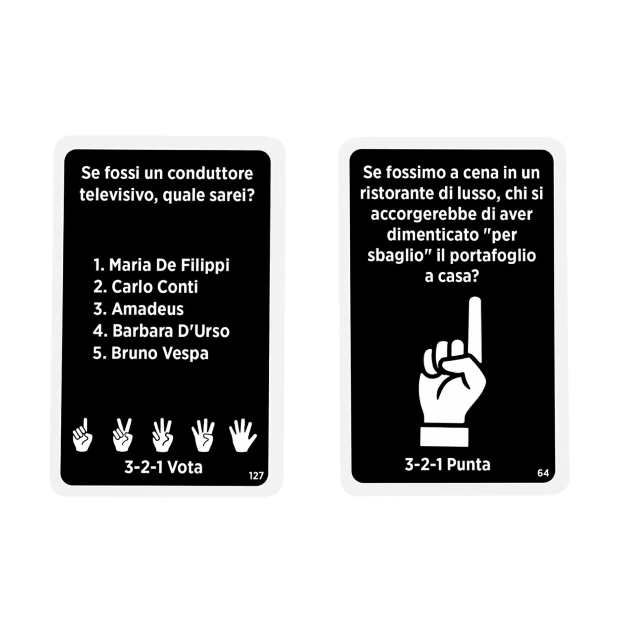 Ci sono due tipi di carte: a scelta multipla, in cui i giocatori votano con le dita (da 1 a 5), e a singola domanda, in cui le dita sono puntate sugli altri giocatori.