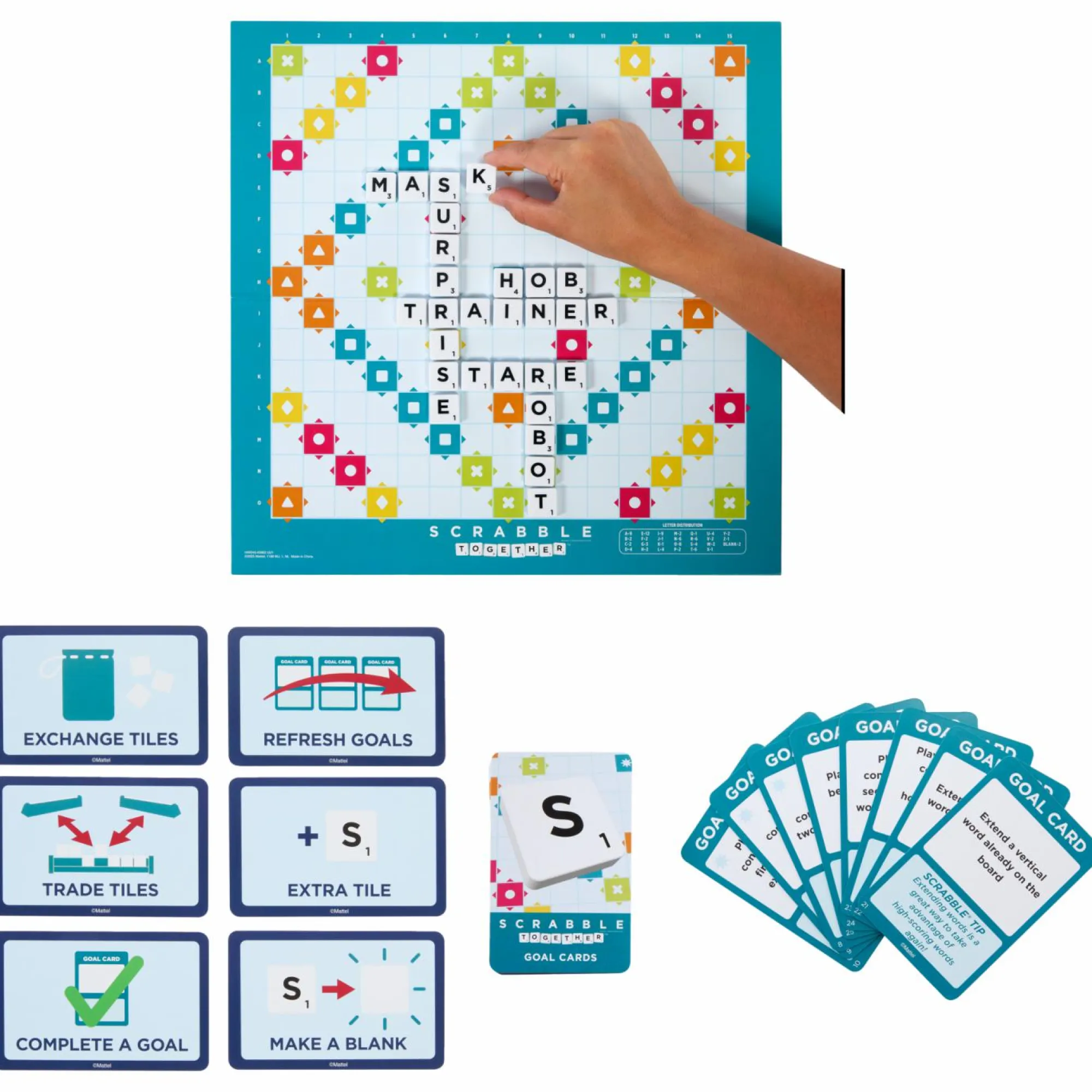 In Scrabble™ Parole di Squadra, giochi in squadra per completare 50 Obiettivi che insegnano le basi di Scrabble®.