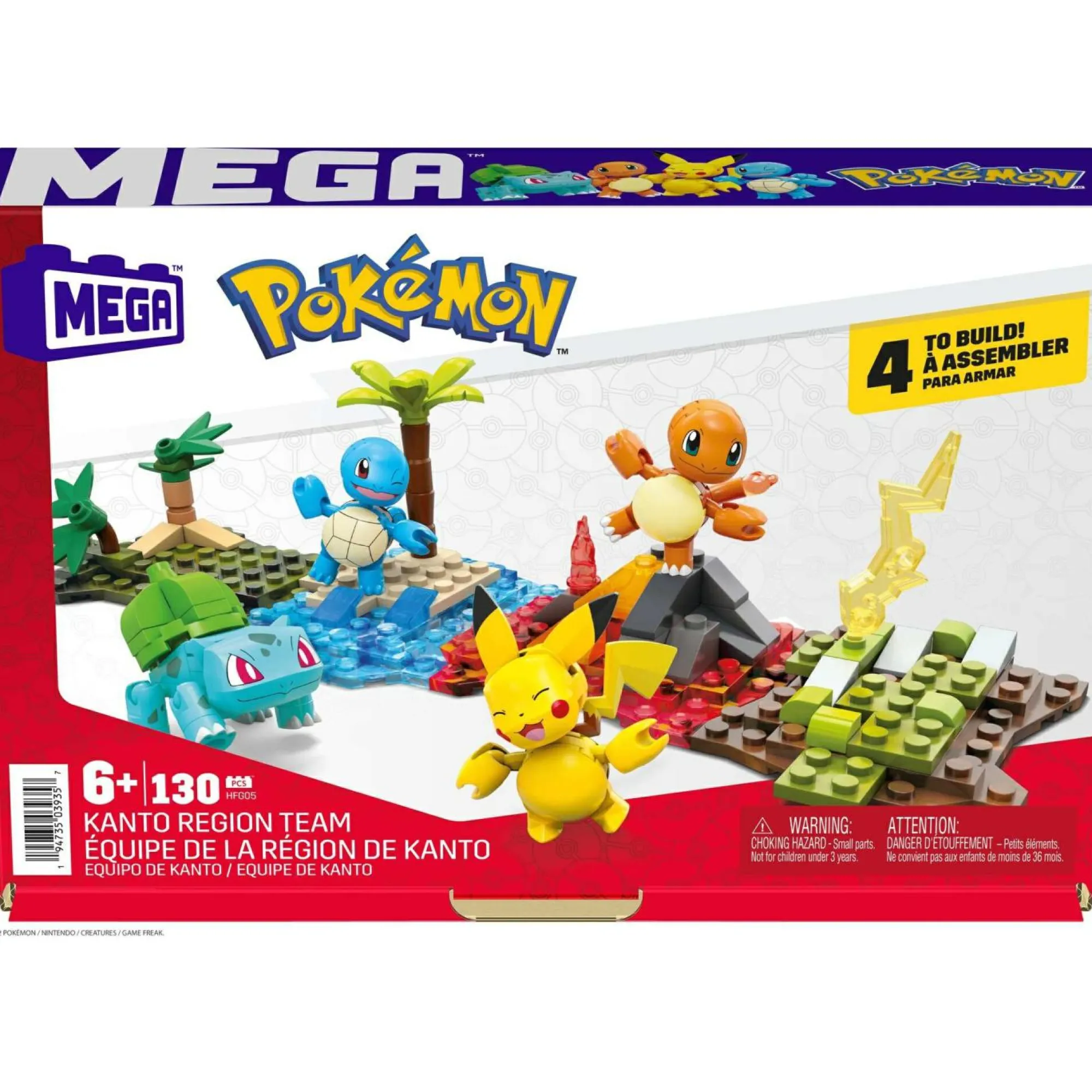 Il set include Pikachu, Squirtle, Charmander e Bulbasaur, oltre a supporti per ambienti da costruire