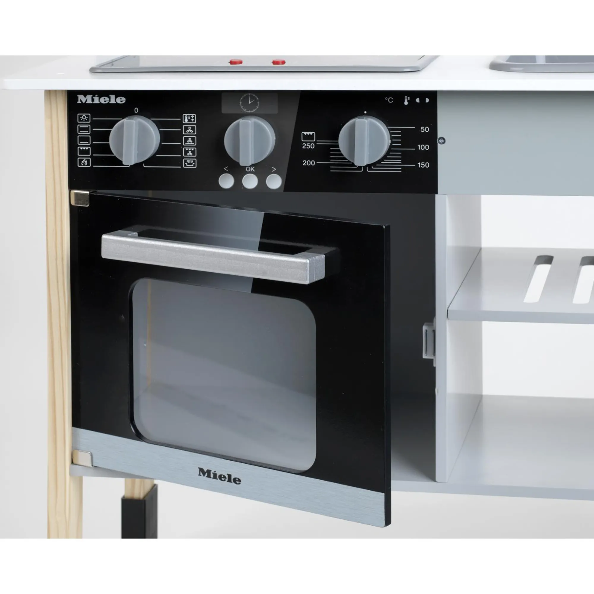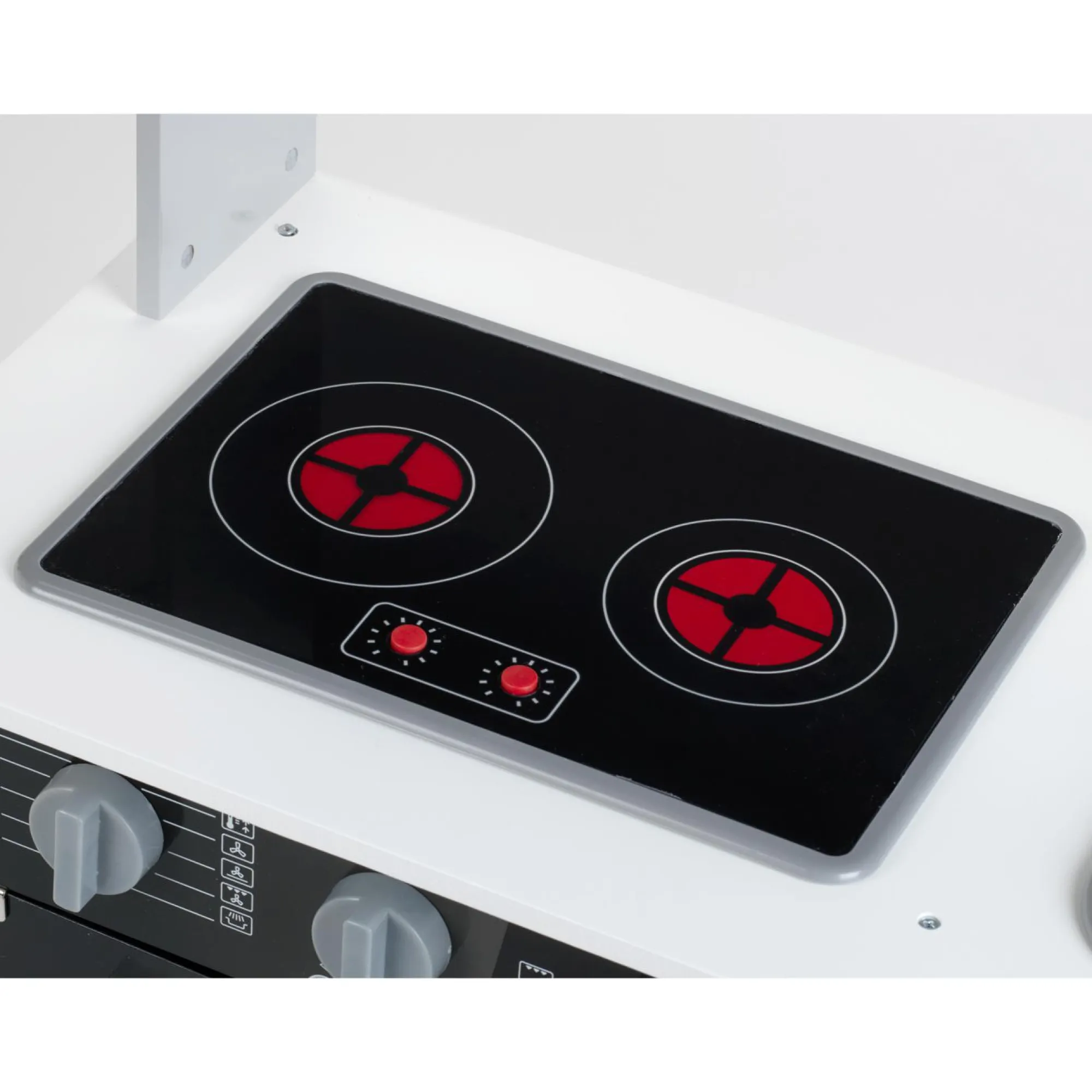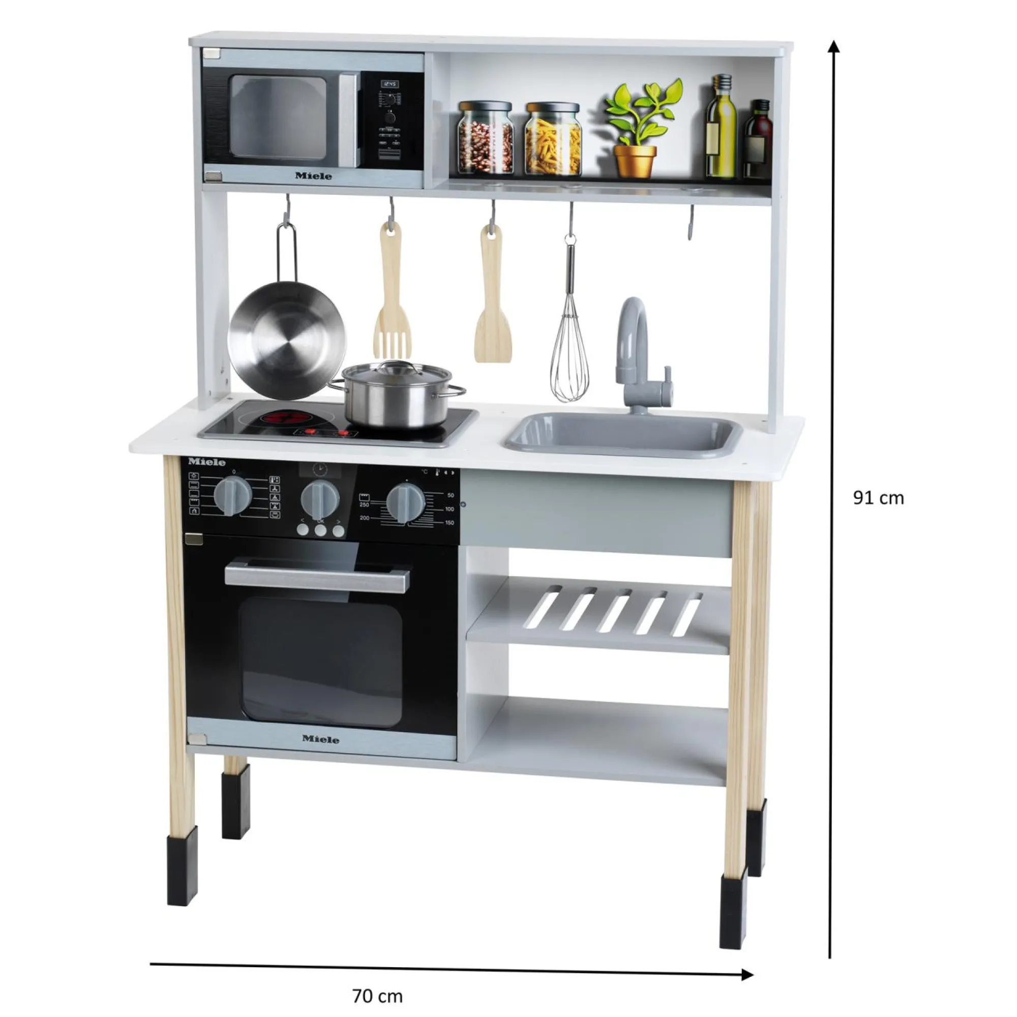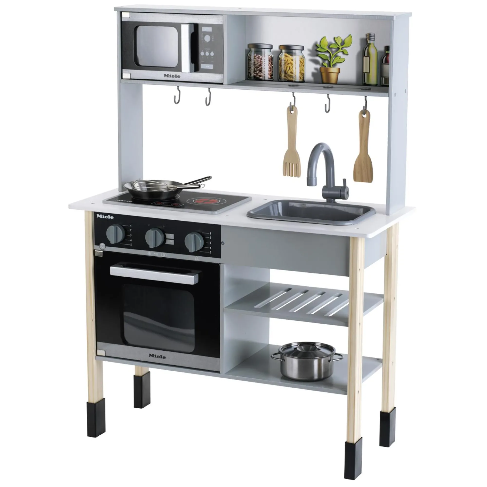 Cucina in legno con fornello, piano cottura, lavello estraibile e stoviglie in legno e metallo