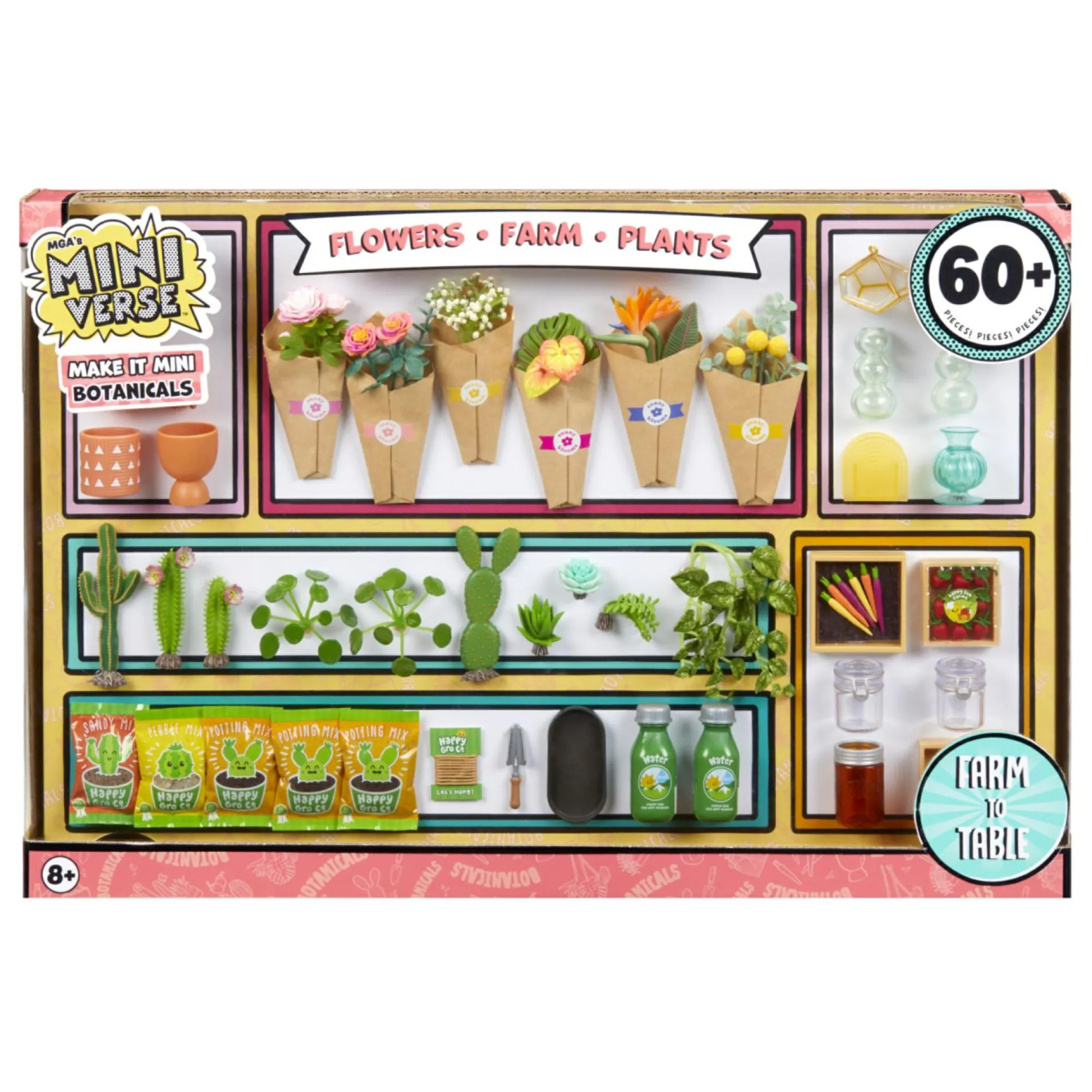 Oltre 60 pezzi inclusi in questo grande playset. Crea i tuoi fiori, fattoria e pianta Make It Minis con tutti gli articoli inclusi.