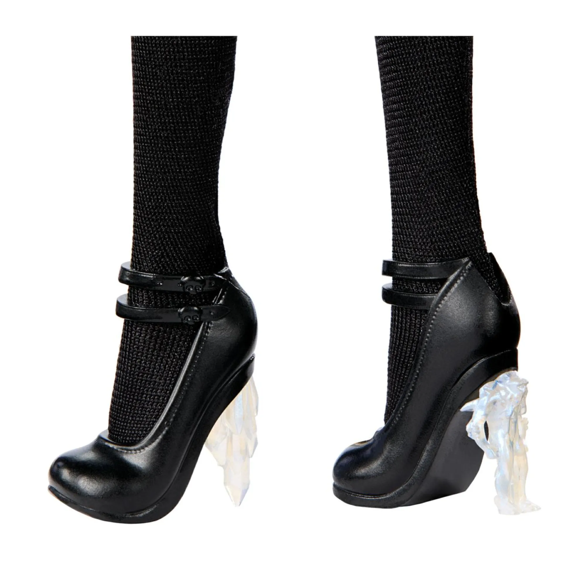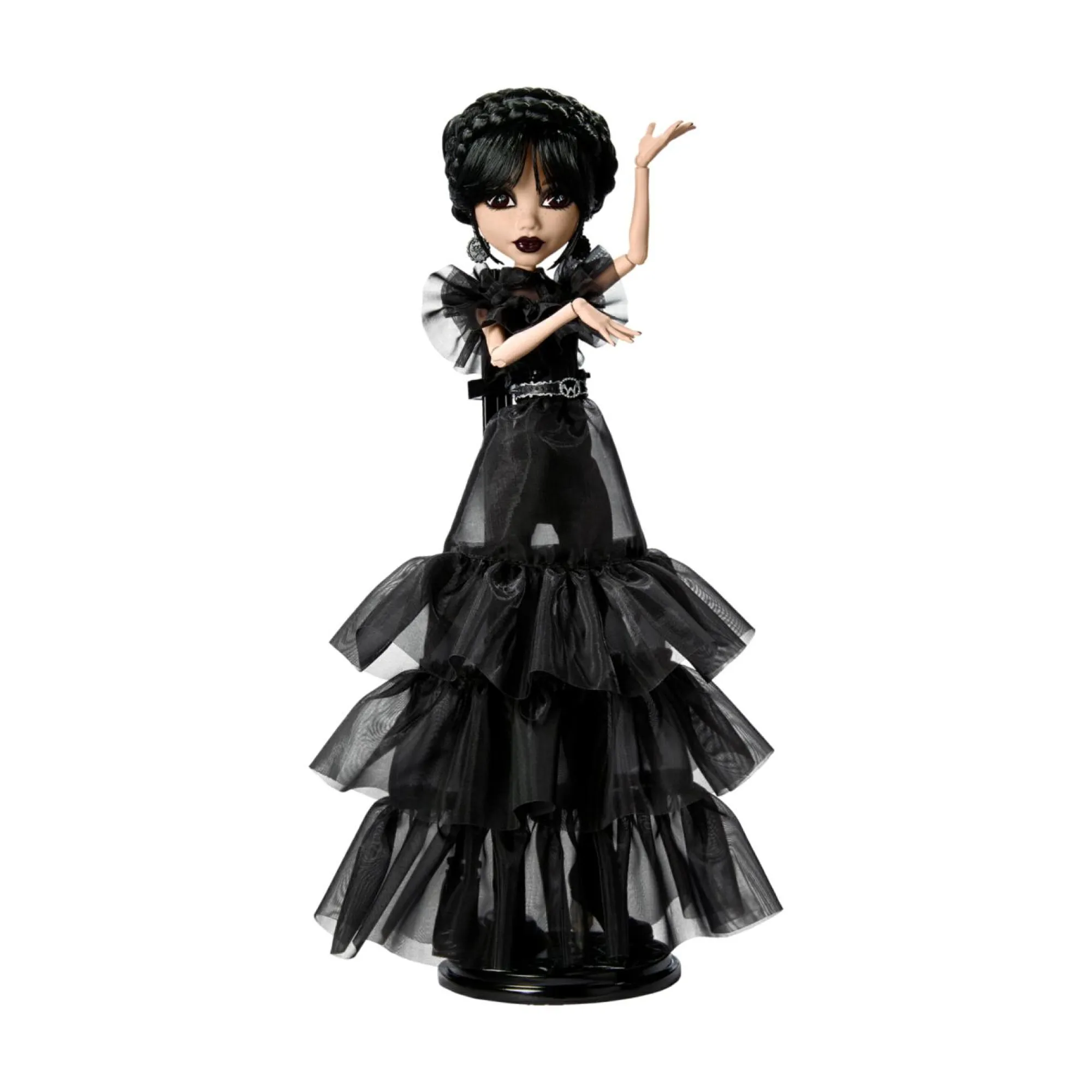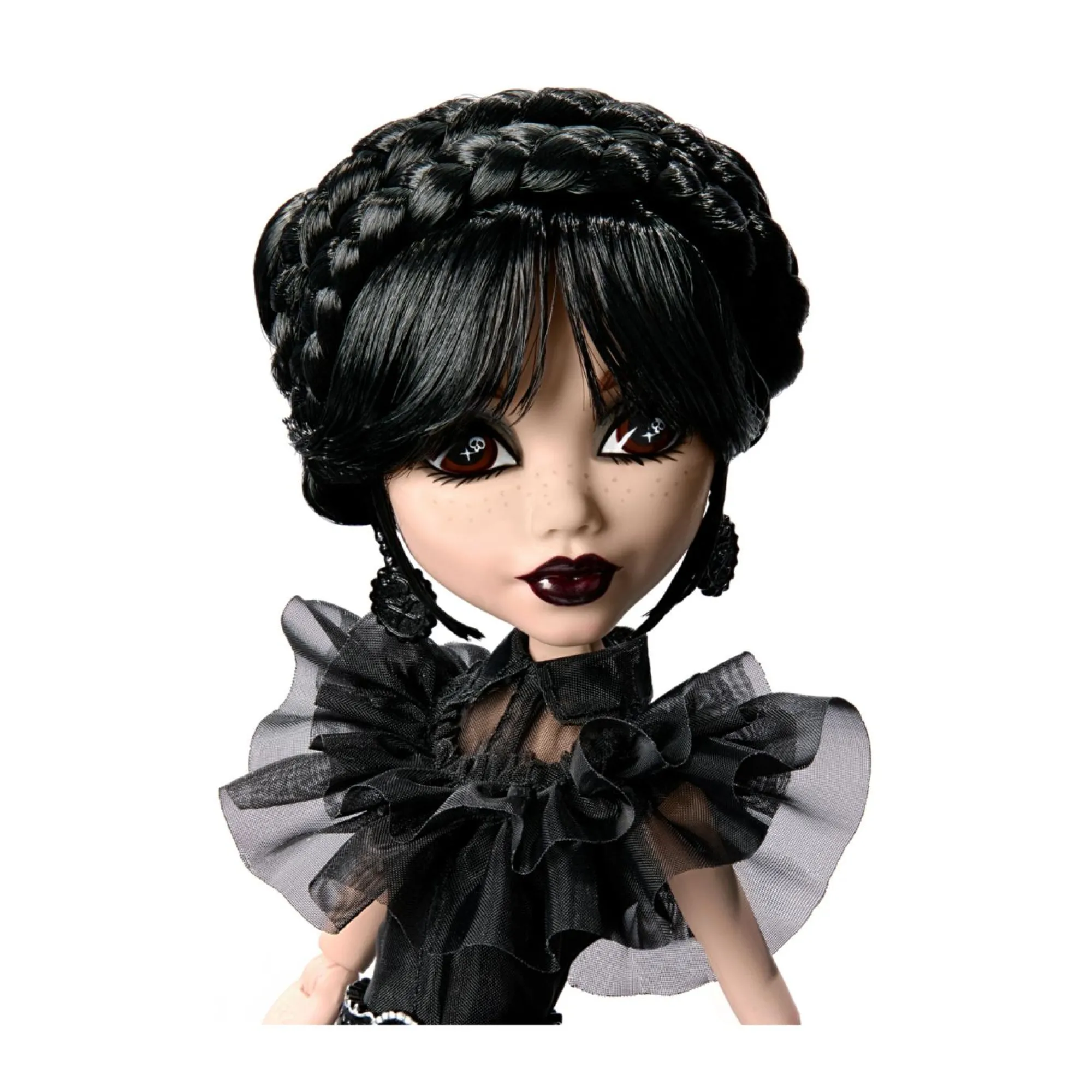 Una triste serata! L’abito nero di mezzanotte, un abito vintage ispirato a quello del suo personaggio nella scena del ballo scolastico presente nella serie, dona alla bambola Rave’N Mercoledì uno stile gotico glam.