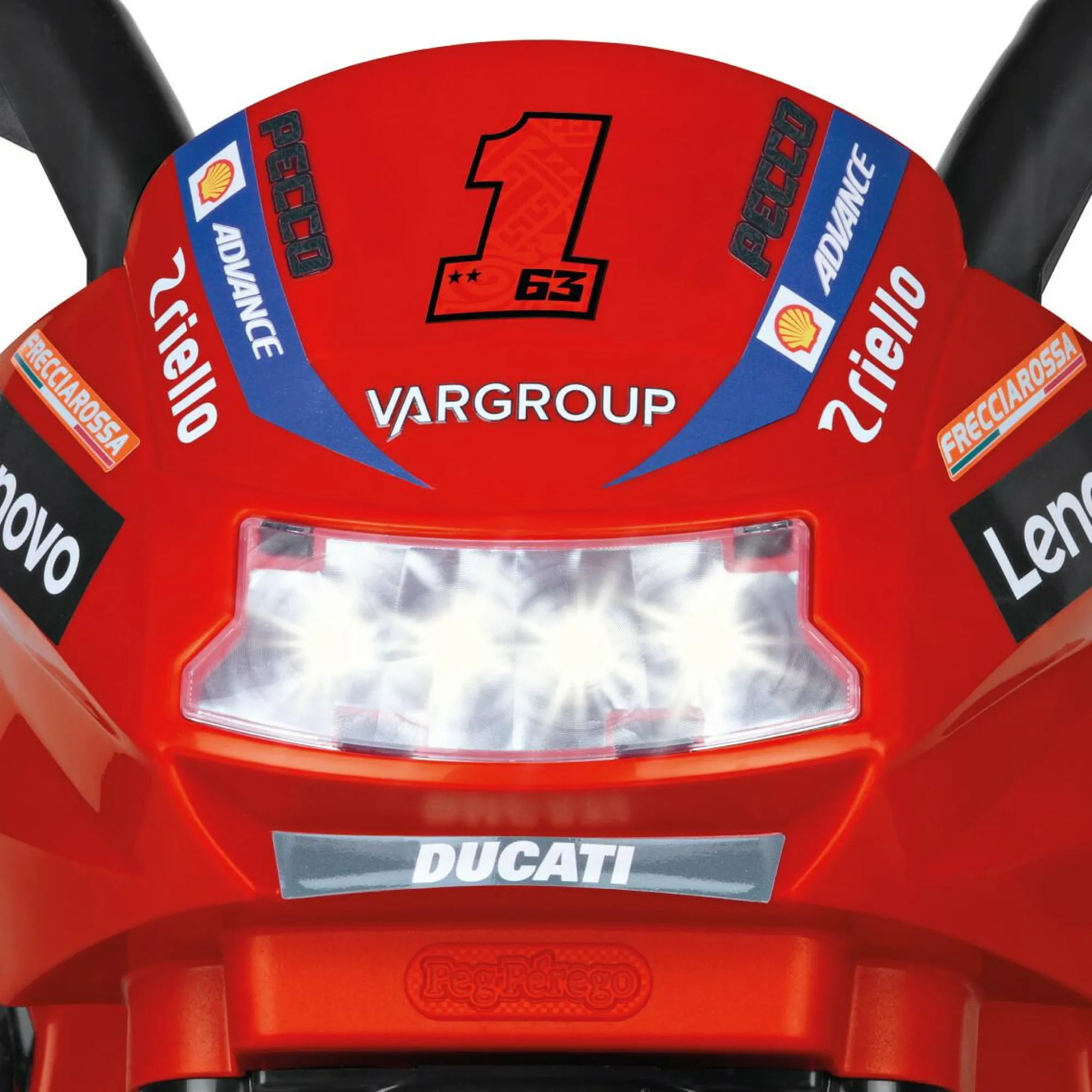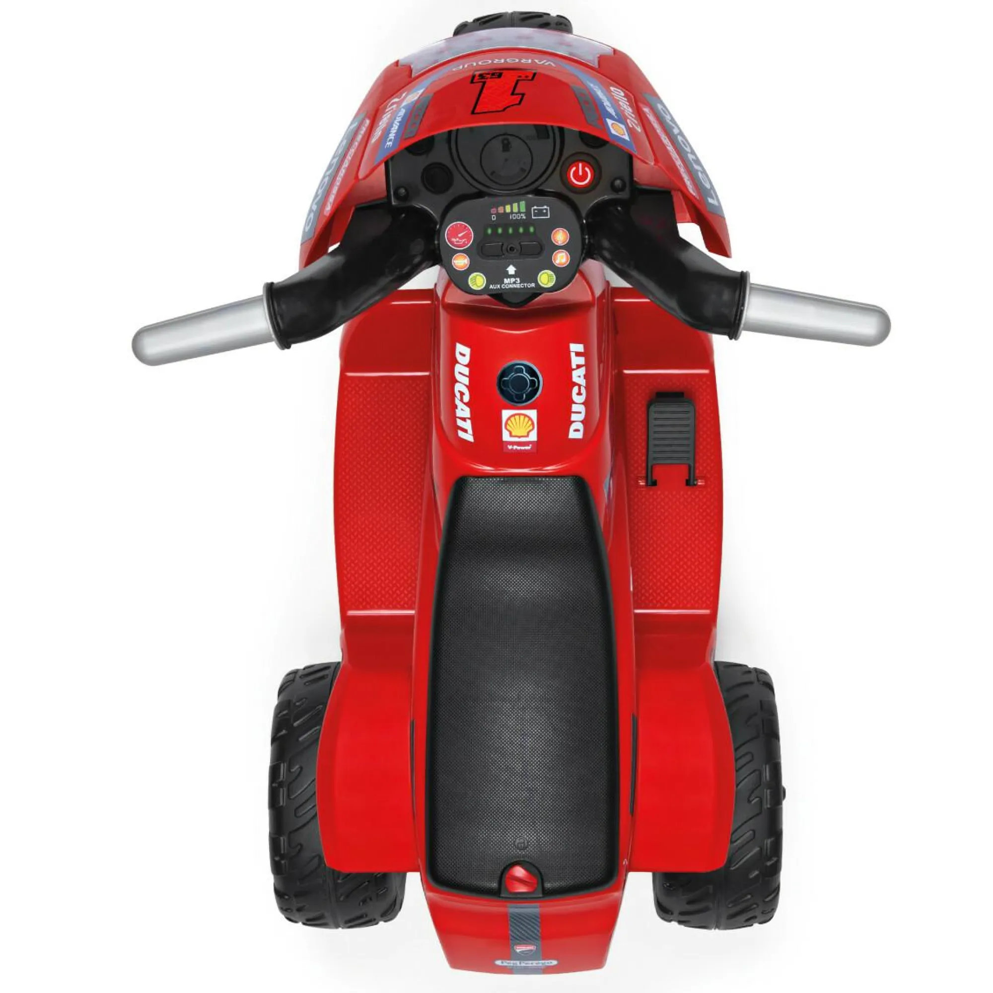 Accendi il cruscotto elettronico con il pulsante START o premi il pedale acceleratore e ti stupirai! Oltre alla luce LED del fanale anteriore, sentirai il rombo del motore, e potrai azionare il clacson e le melodie preregistrate. Per sentire la tua musica preferita, utilizza l’attacco per collegare il tuo lettore MP3, (non incluso).
