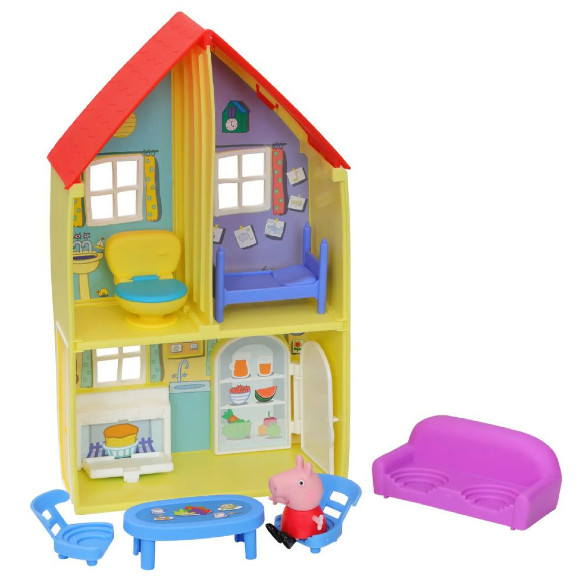 INCLUDE ACTION FIGURE DI PEPPA PIG E 6 ACCESSORI DIVERTENTI: i bambini e le bambine in età prescolare possono decorare le 3 stanze della casa con un letto, un tavolo, 2 sedie, un divano e un wc (per il bagno, ovviamente)