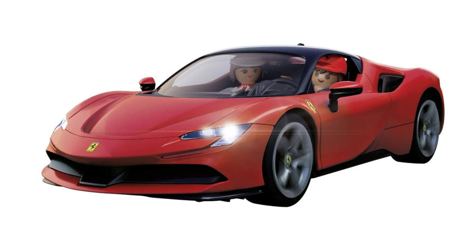 Il set contiene una Ferrari SF90 Stradale PLAYMOBIL con luci, due personaggi PLAYMOBIL, due sacche da golf, una valigia e altri fantastici extra.