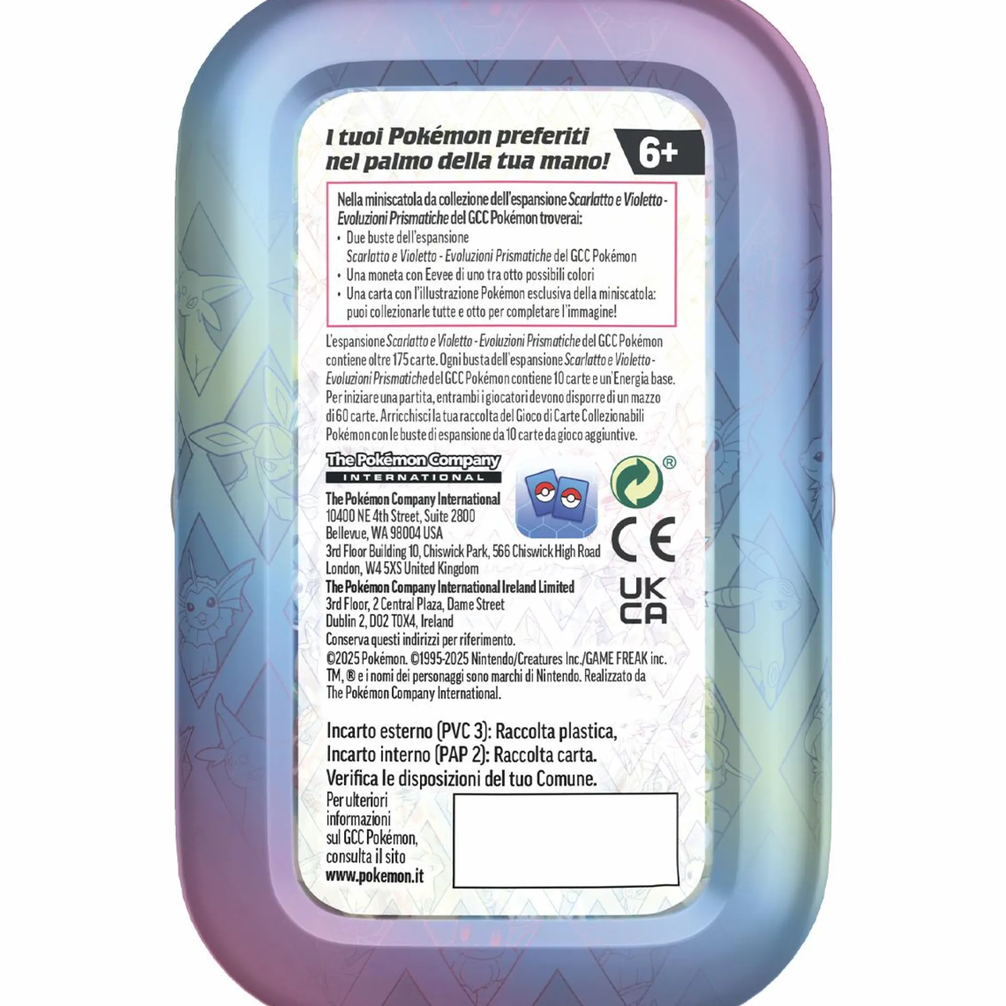 1 Mini Tin assortita in diversi modelli unica con design esclusivi di Pokémon Scarlatto e Violetto – Evoluzioni Prismatiche