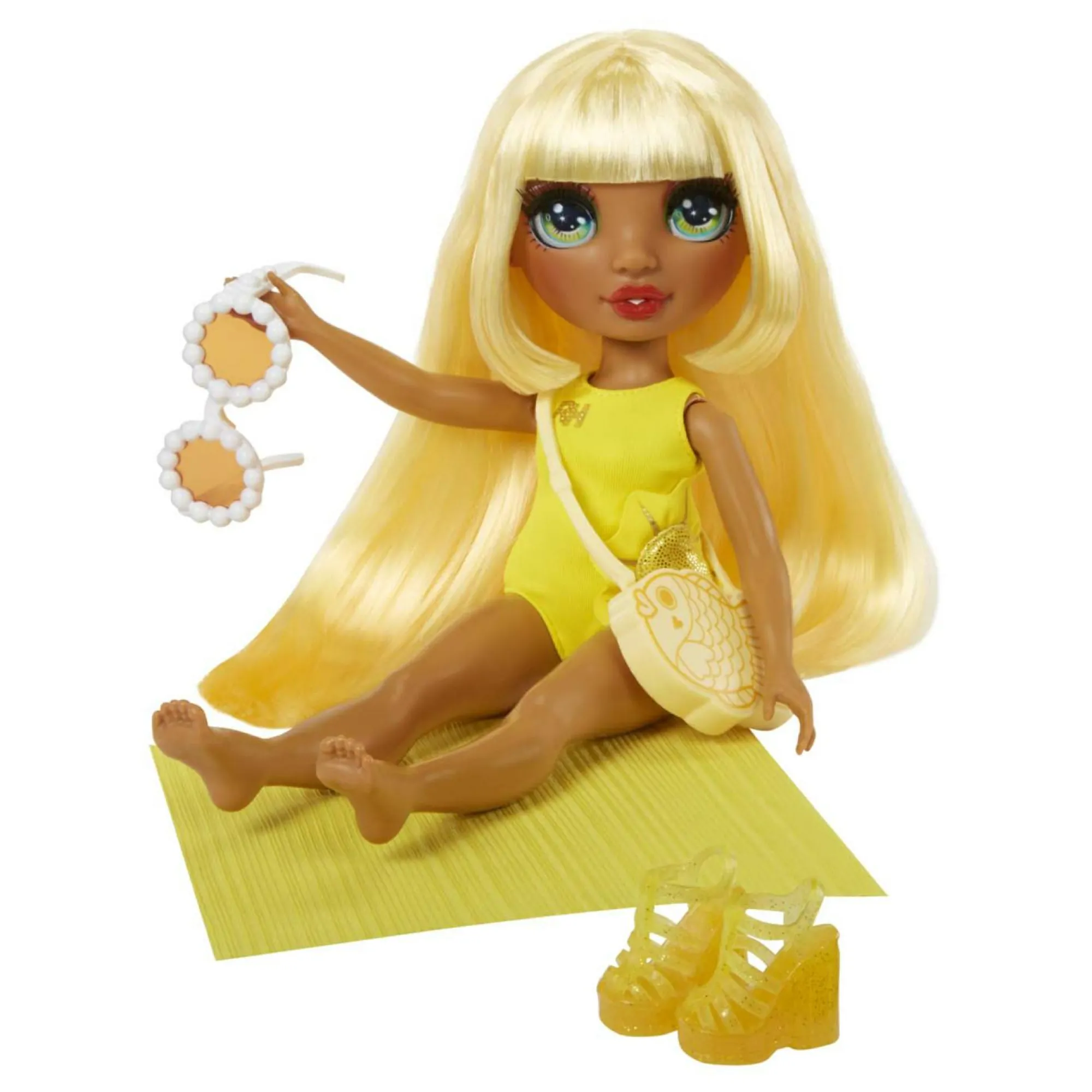 Sunny pronta per il divertimento con amici: costume da bagno giallo, sandali, occhiali da sole e borsetta per giochi in piscina e altro ancora!