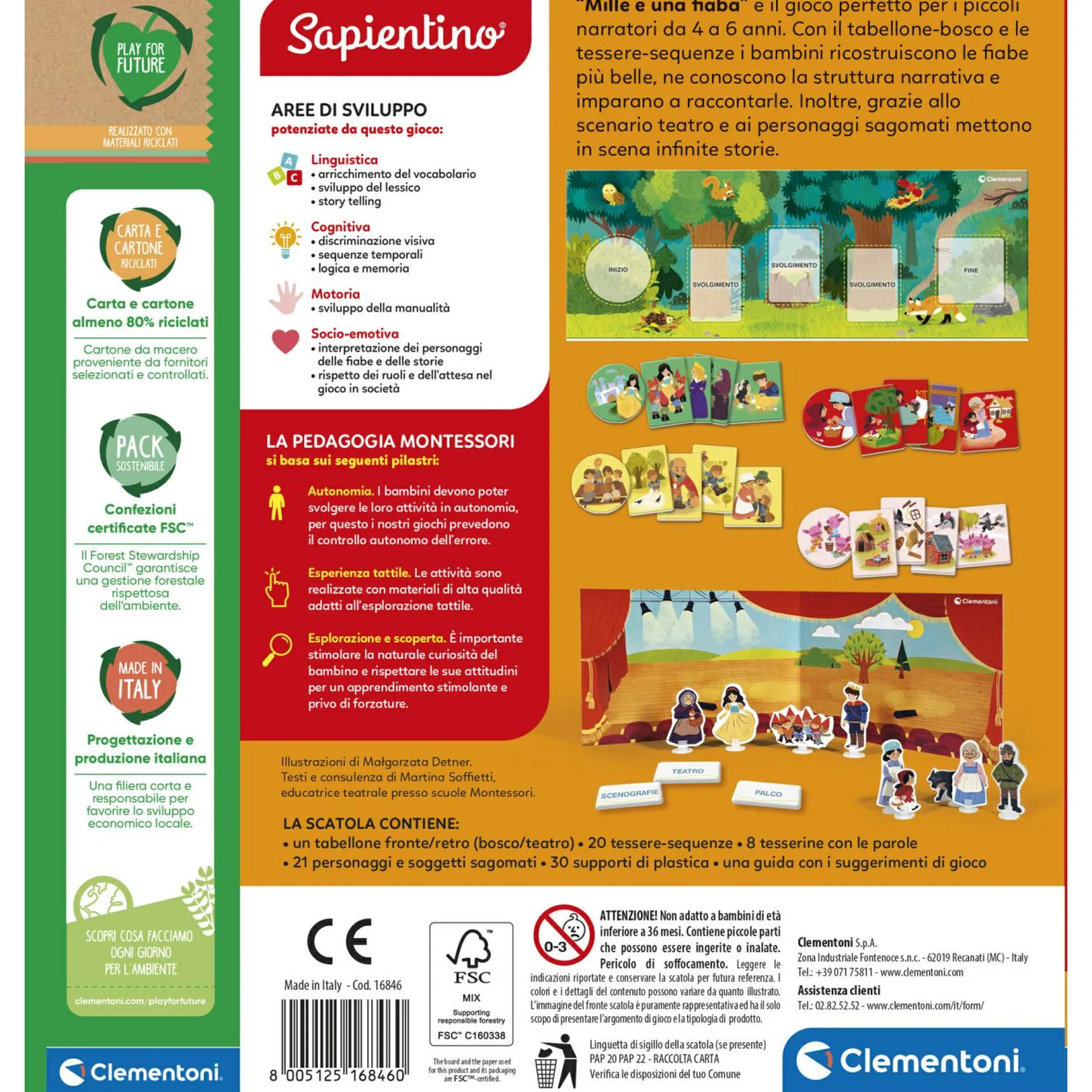 Include 1 tabellone bosco/teatro, 20 tessere sequenze per ricostruire le fiabe, 8 tessere con le parole e 21 personaggi sagomati per mettere in scena le fiabe.