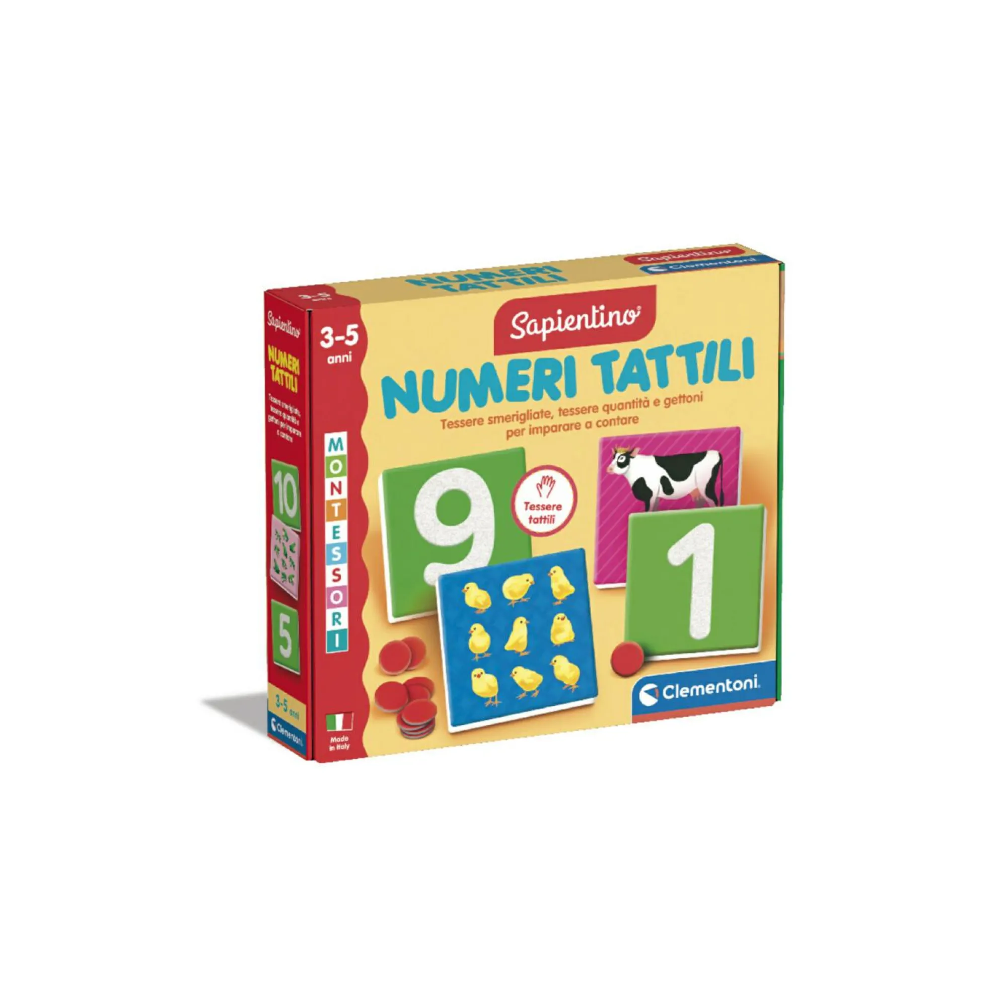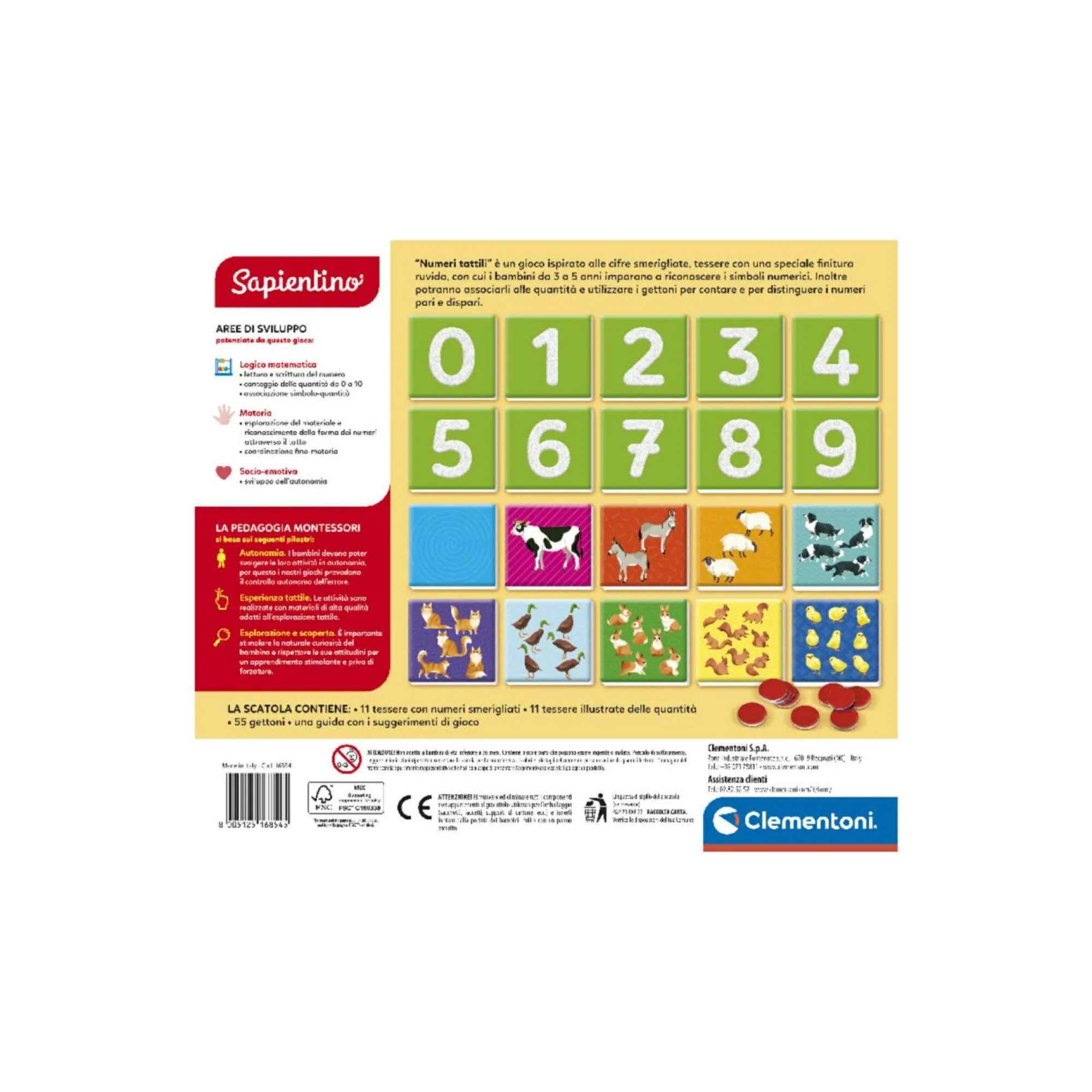 Contiene 10 tessere delle cifre smerigliate, ovvero con una speciale finitura ruvida da toccare per memorizzarne la forma.