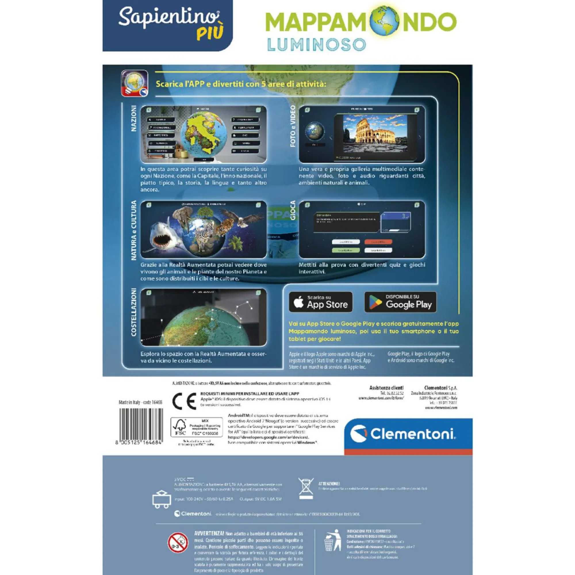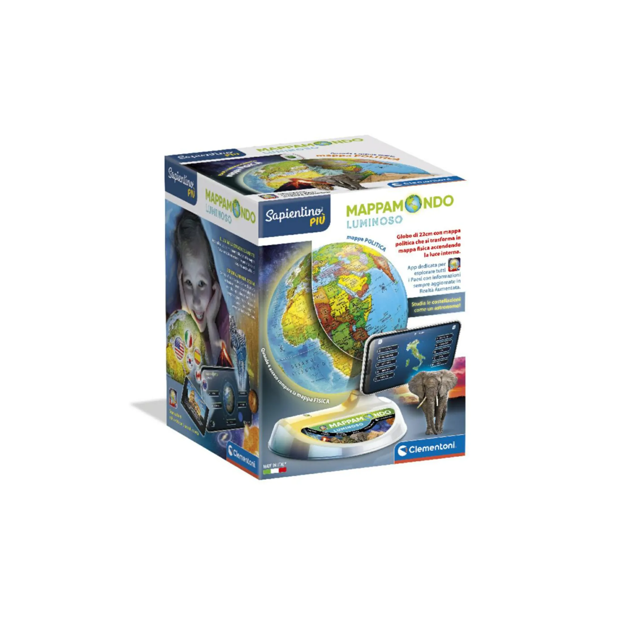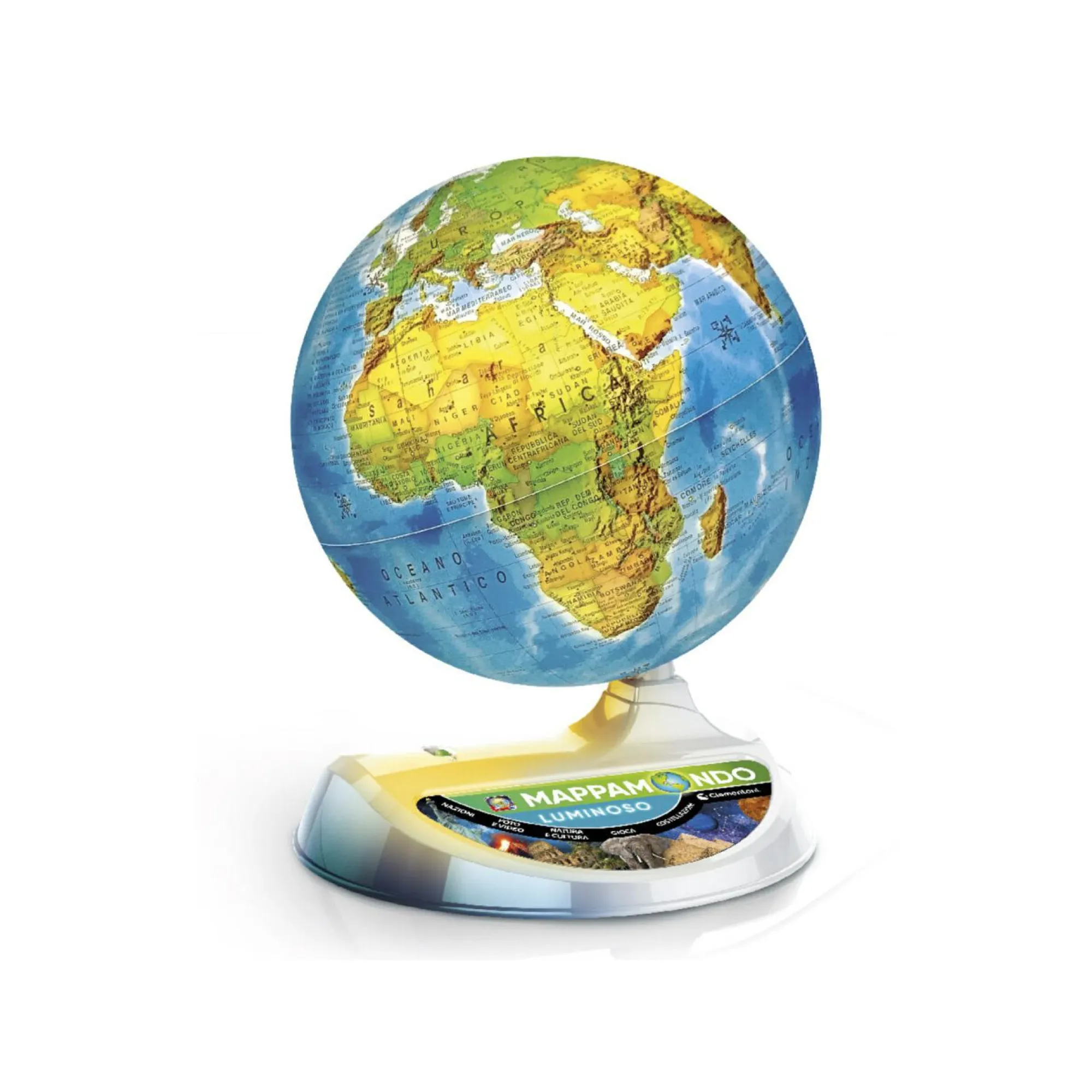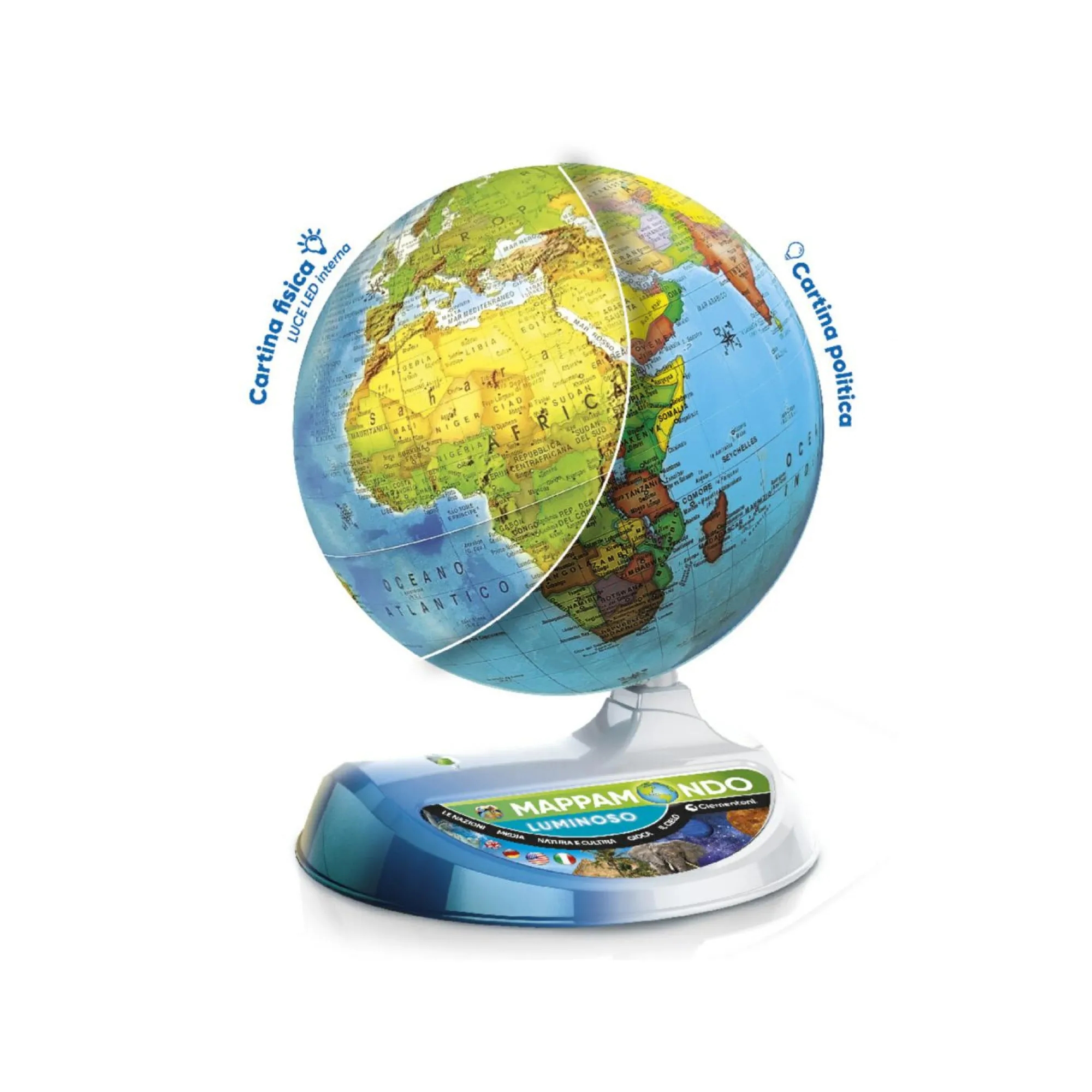 Dotato di LED interno: a luce spenta appare la cartografia politica, a luce accesa la rappresentazione diventa fisica.