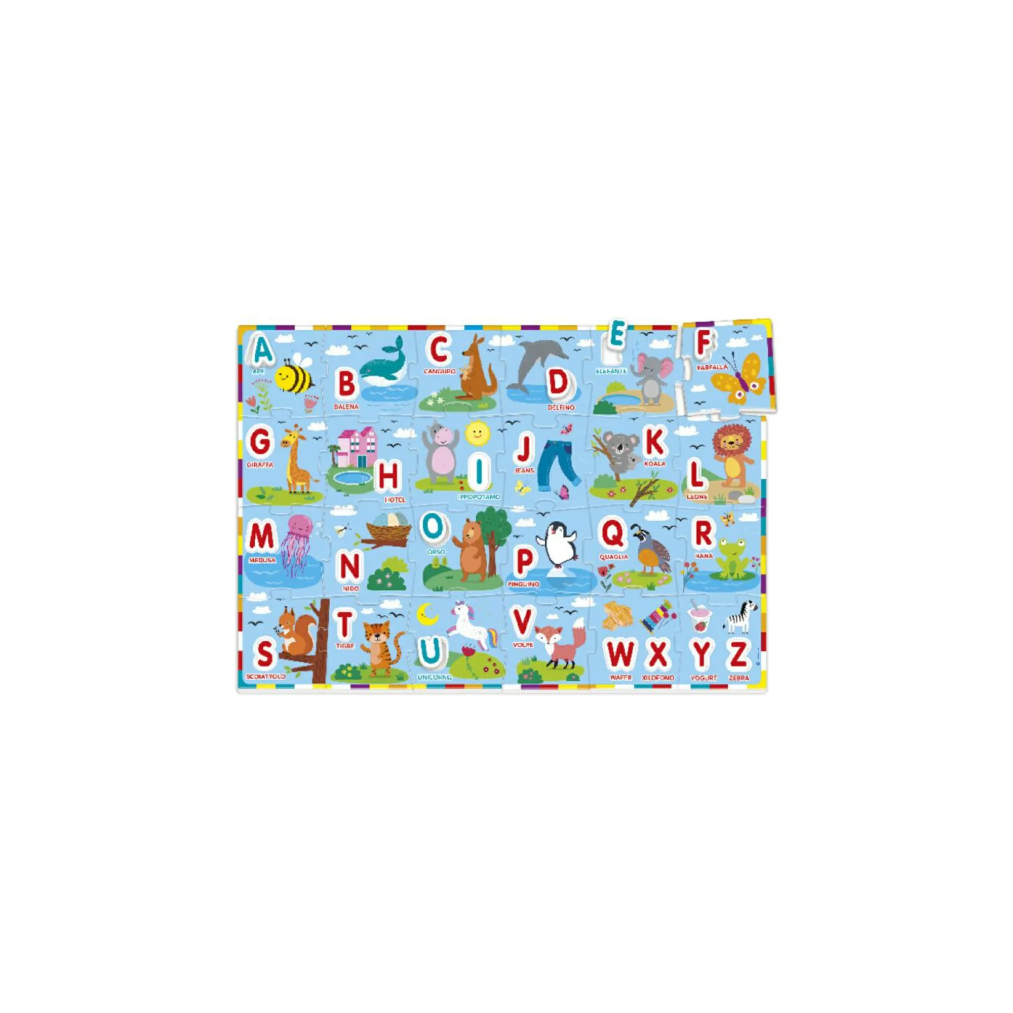 Grande puzzle da pavimento a tema alfabeto con maxi tessere e lettere sagomate da incastrare.