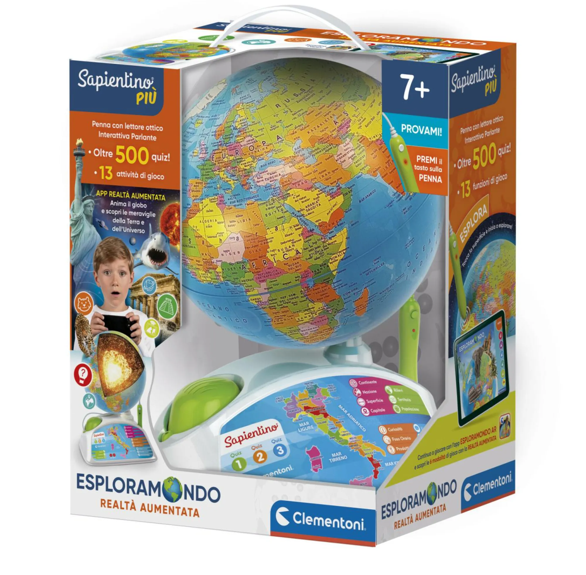 Un globo interattivo per andare alla scoperta delle bellezze del mondo e risolvere divertenti enigmi. Per iniziare il viaggio della conoscenza il bambino dovrà puntare la penna a lettura ottica sul mappamondo per scoprire tutte le informazioni del luogo selezionato. Più di 500 domande suddivise in tre livelli di difficoltà crescente per verificare le nozioni acquisite e sfidare amici e genitori.