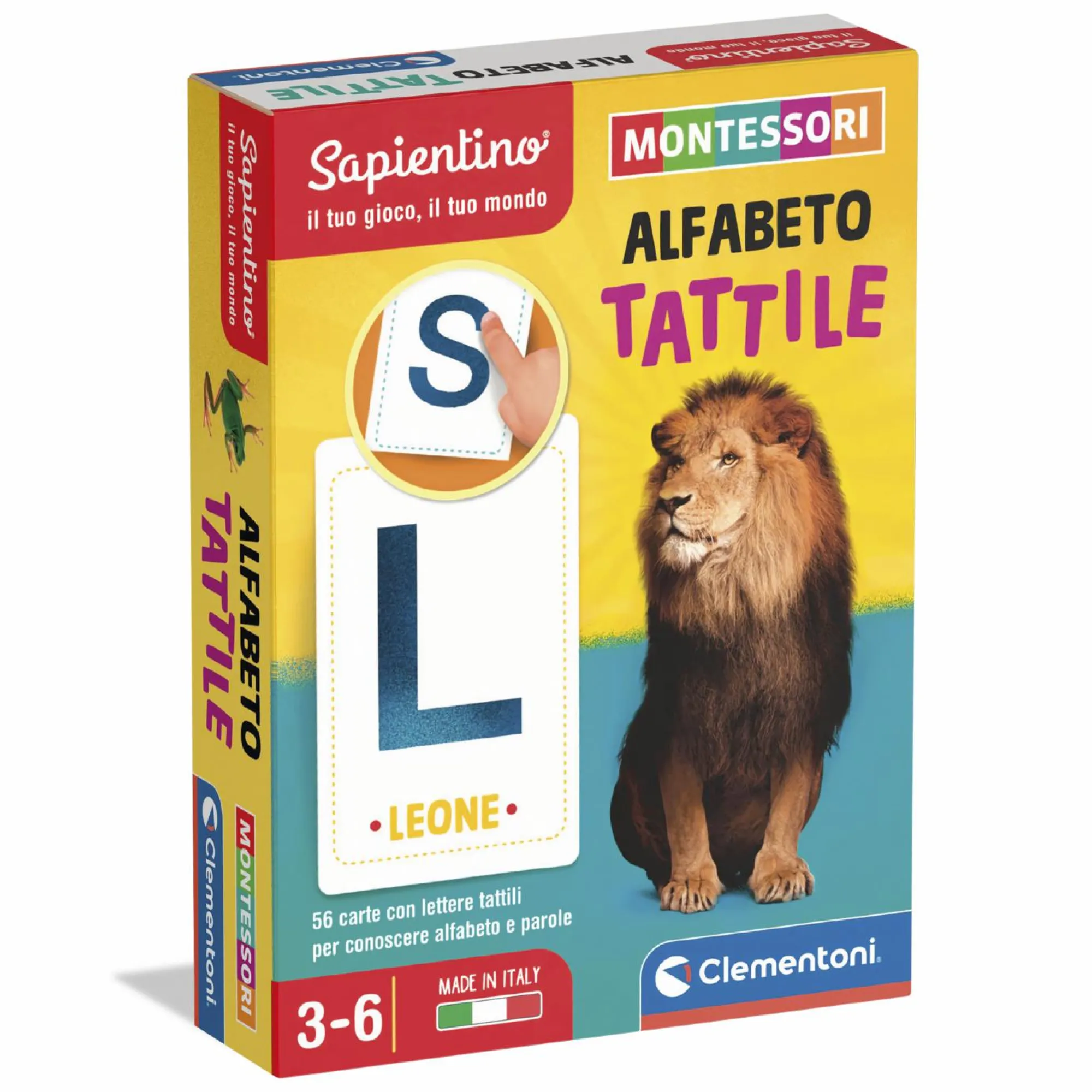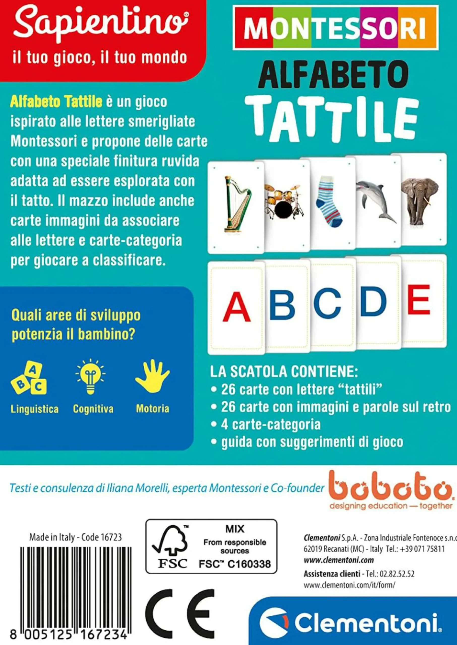 Le carte con le lettere presentano una speciale finitura ruvida che aiuta il bambino a riconoscere le lettere attraverso l’esplorazione tattile.