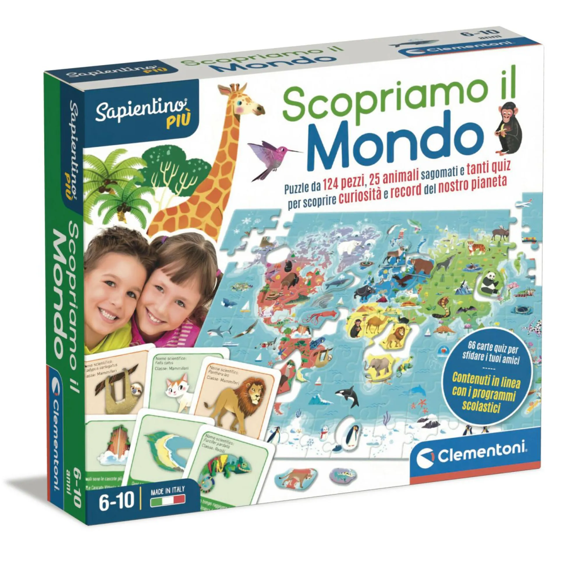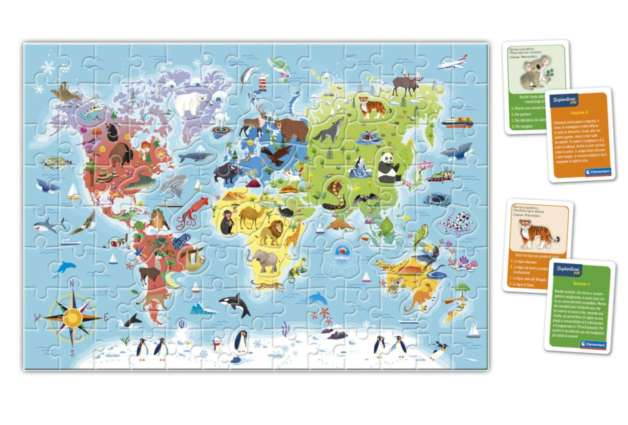 Un puzzle e tante attività di gioco per scoprire gli animali del mondo, i loro habitat e impararne nomi e classificazione. Il gioco contiene un maxi puzzle raffigurante un planisfero con le principali caratteristiche fisiche, le sagome degli animali e immagini relative alla vegetazione tipica dei vari habitat.