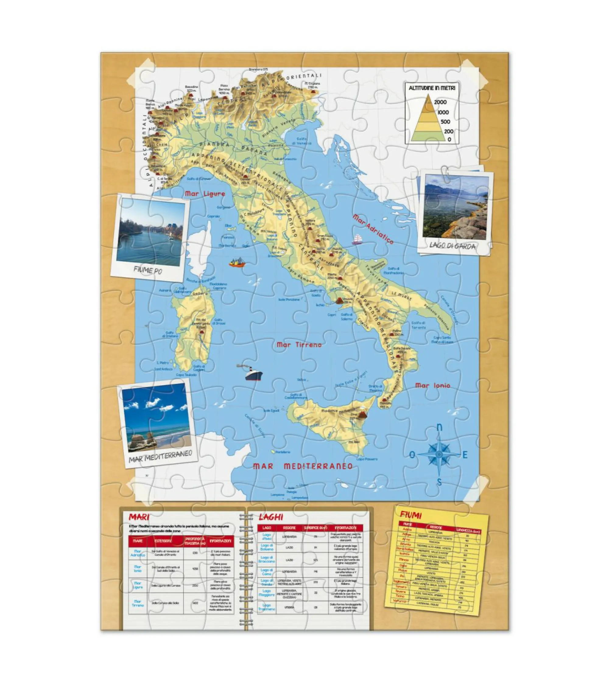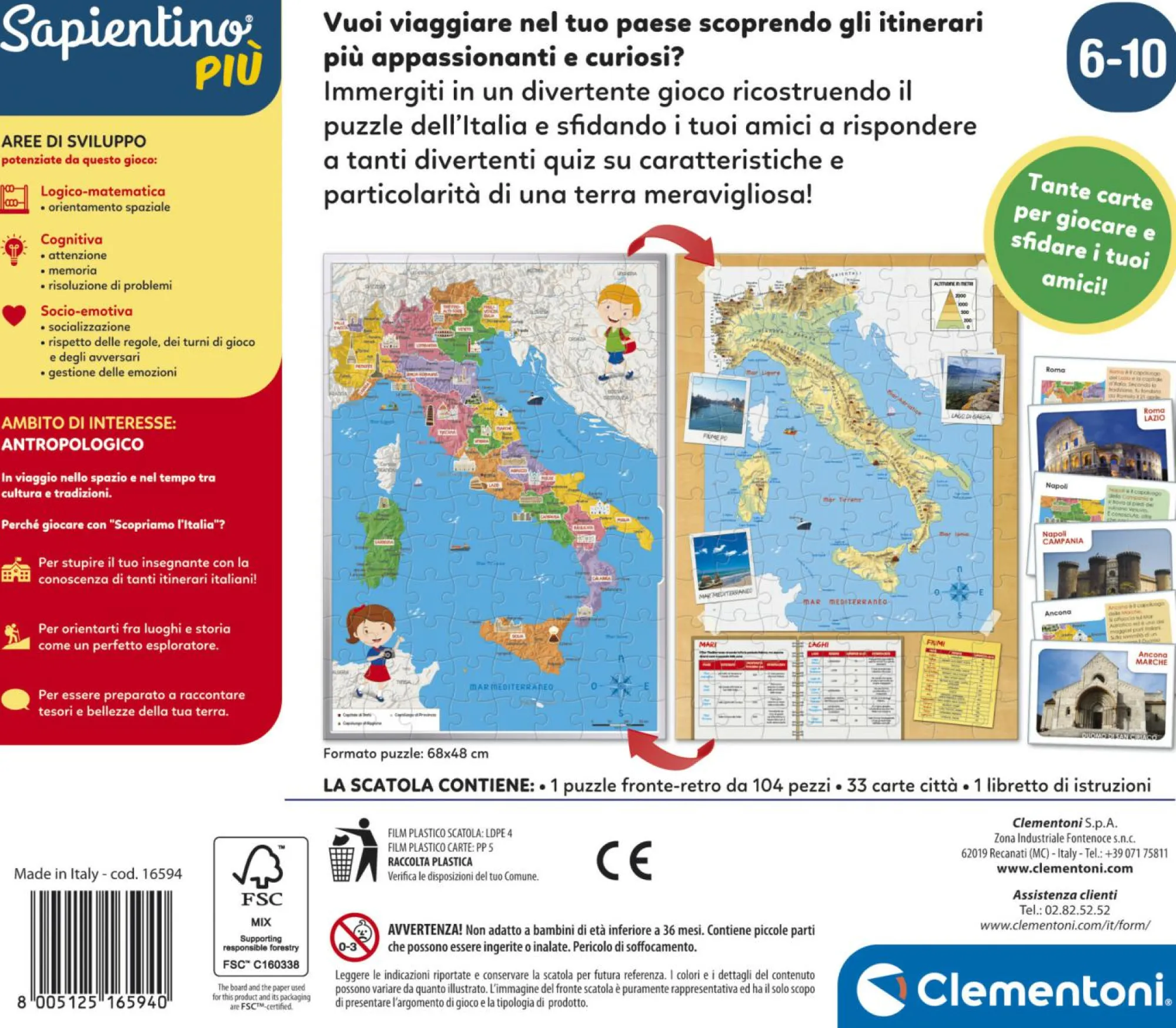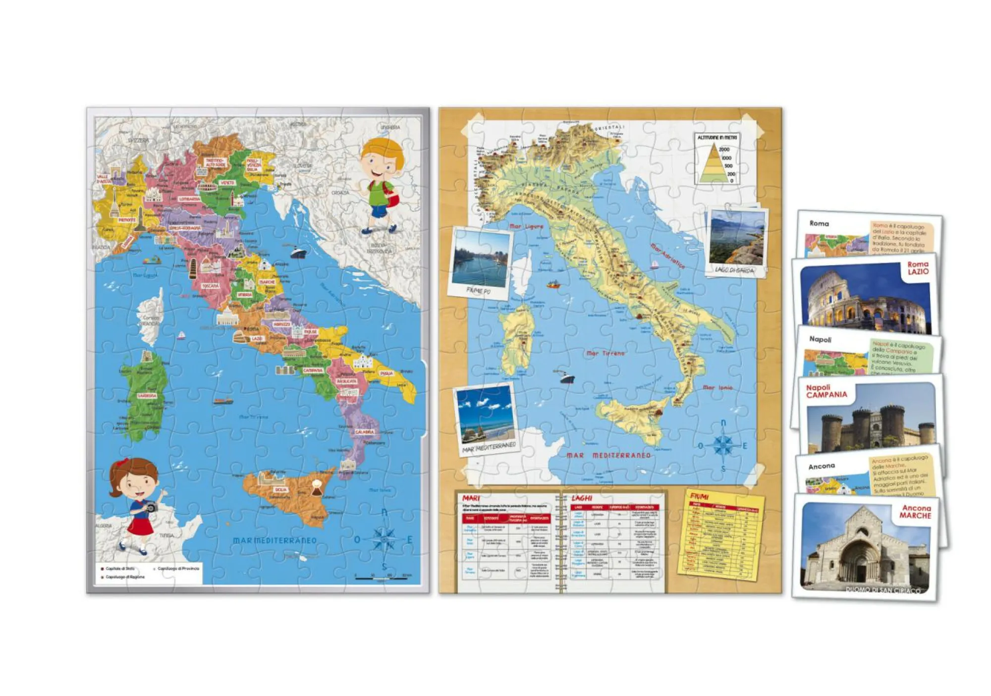 Un puzzle fronte retro con la cartina dell’Italia fisica e politica e un divertente gioco di carte per sfidare gli amici.