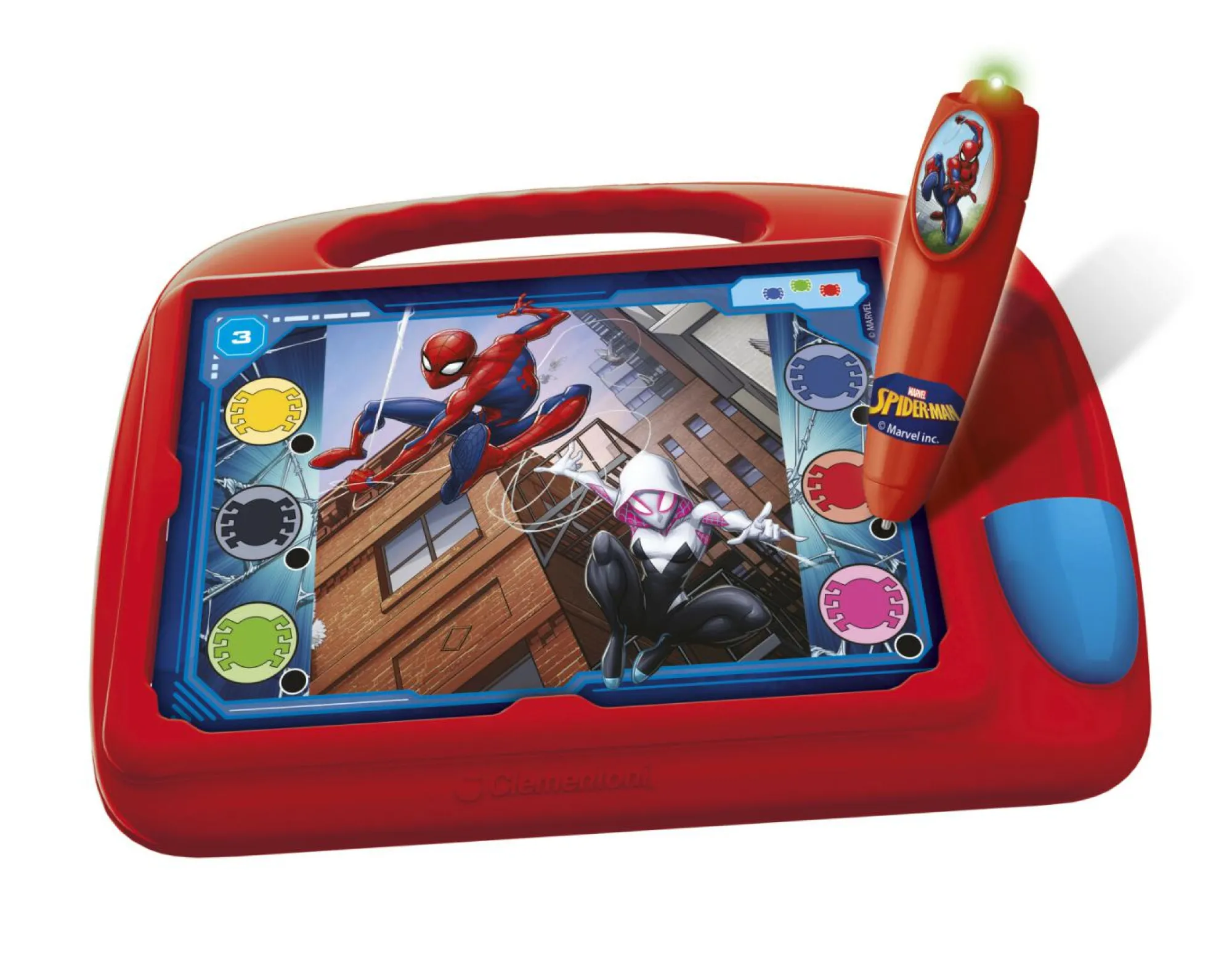 Un pratico banchetto in plastica per apprendere e divertirsi con la penna interattiva e le schede educative in compagnia di Spiderman!