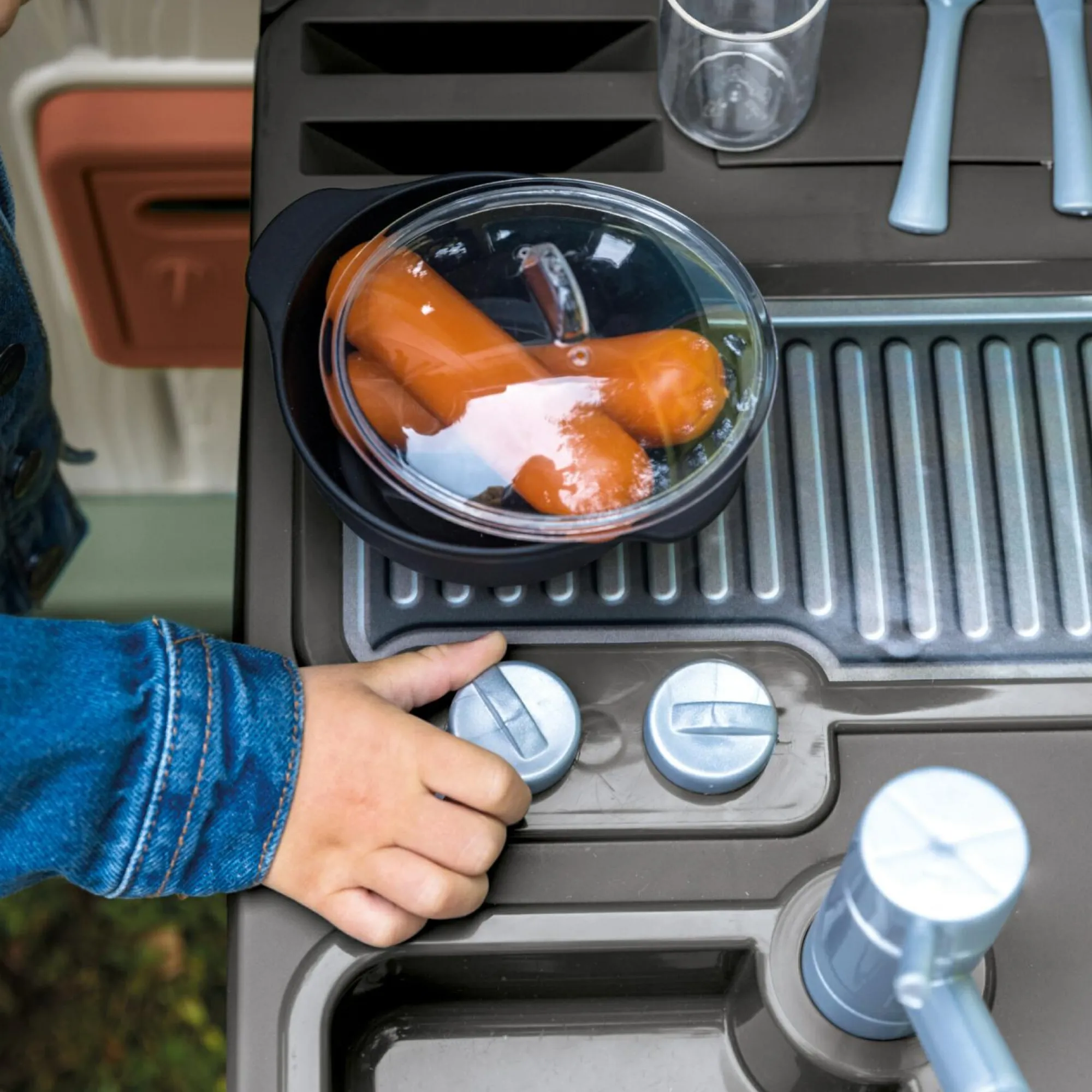 Include 17 accessori: piatti, bicchieri, posate, pentola e altro.