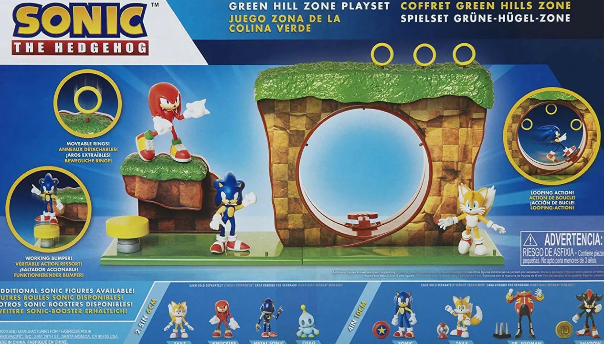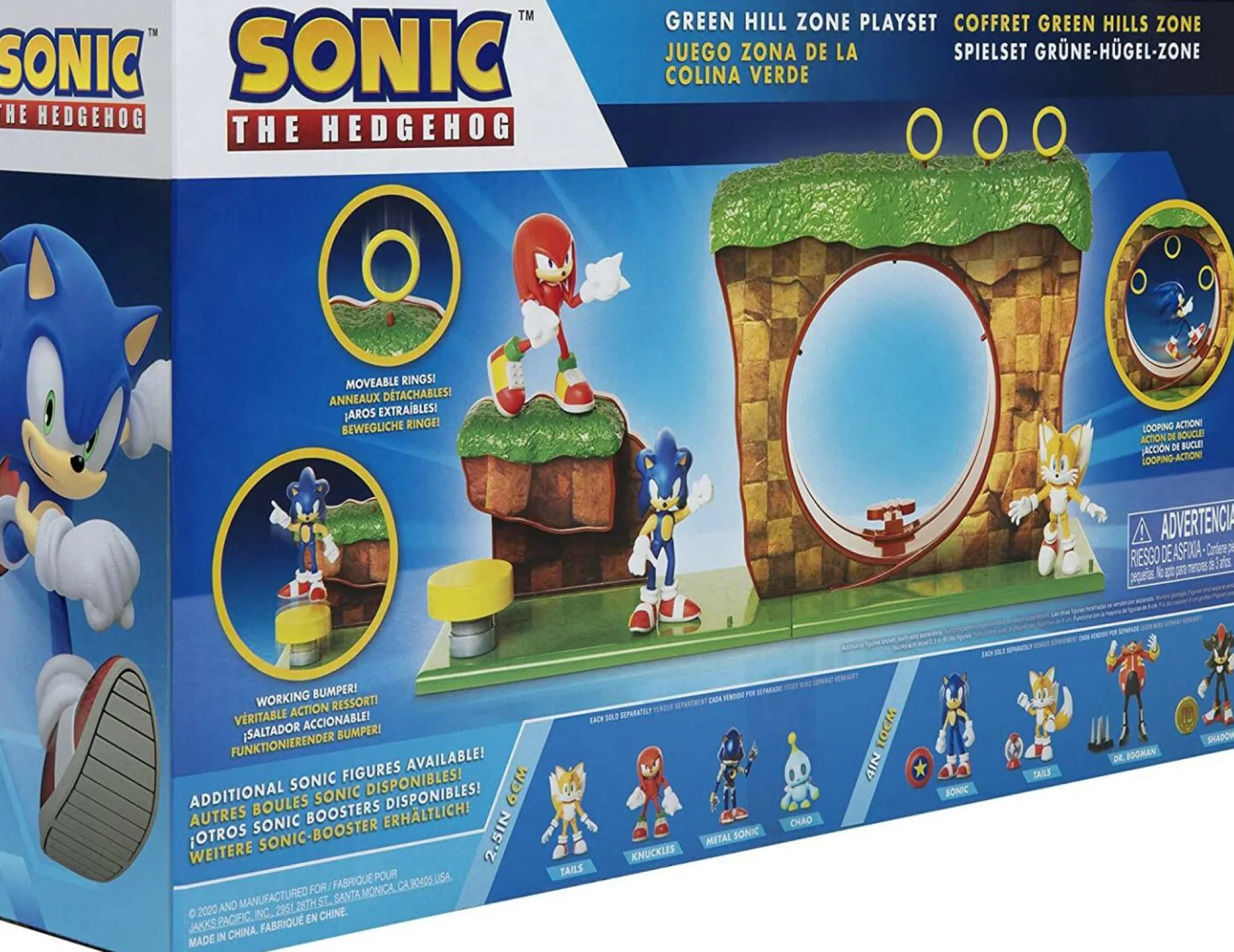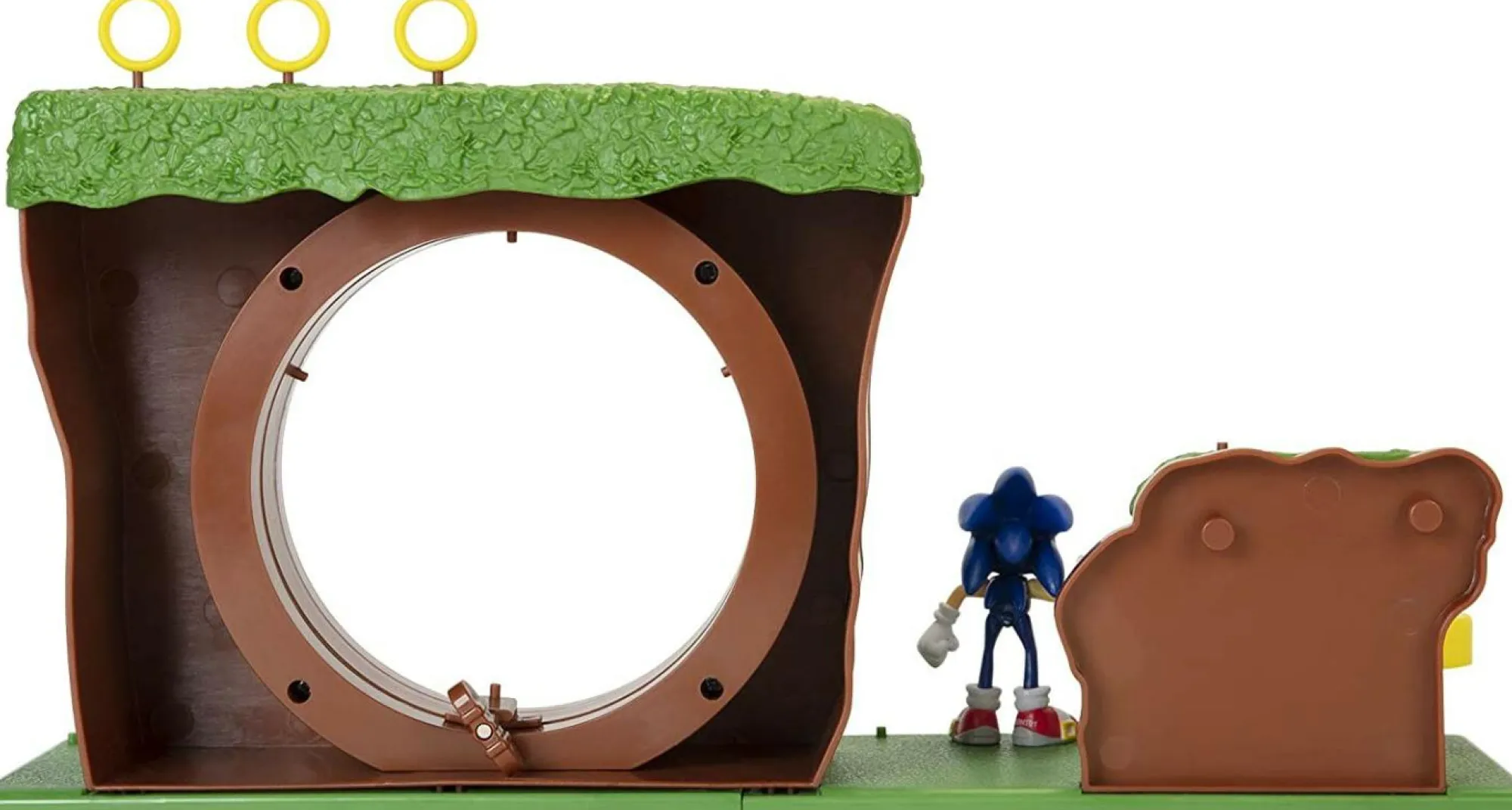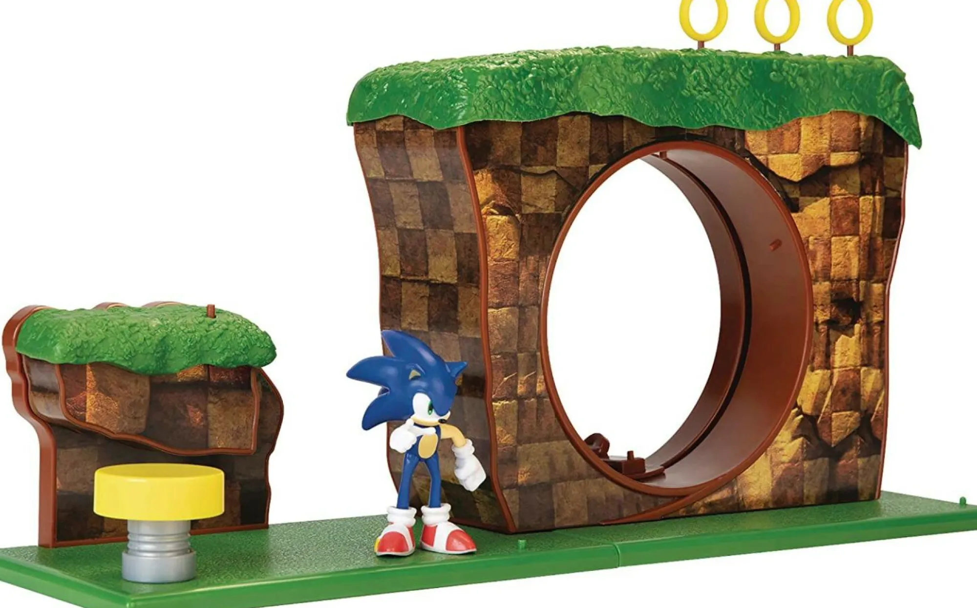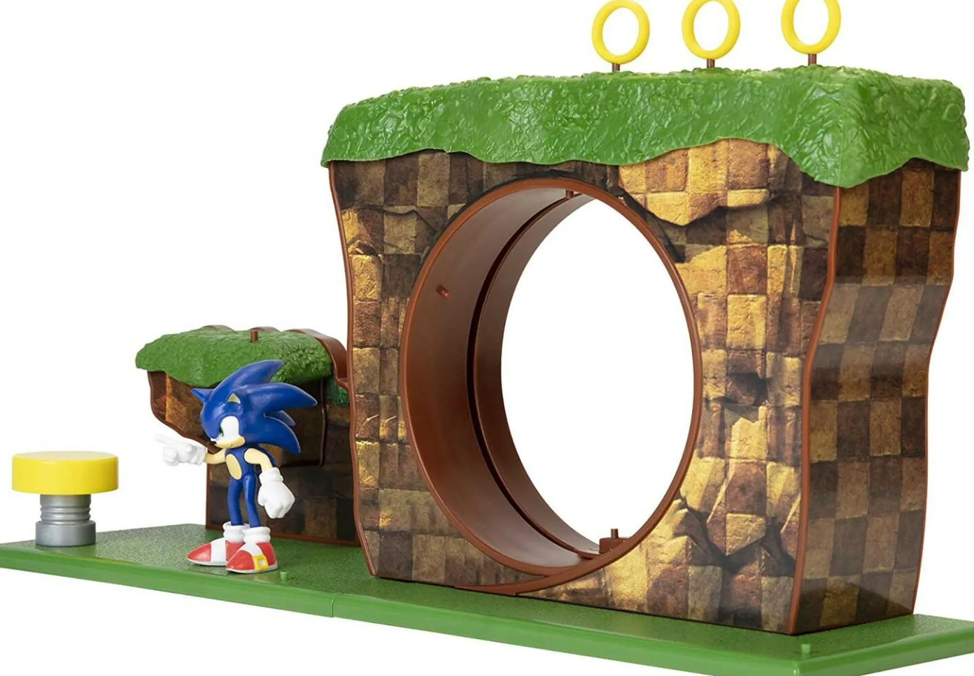 Questo playset include un personaggio di Sonic in scala di due pollici e mezzo e un anello rotante in cui puoi far girare Sonic in giro a velocità super. C’è anche un paraurti rimbalzante in cui puoi far rimbalzare Sonic e farlo atterrare in cima al circuito della Green Hill Zone. Questo playset non richiede batterie.