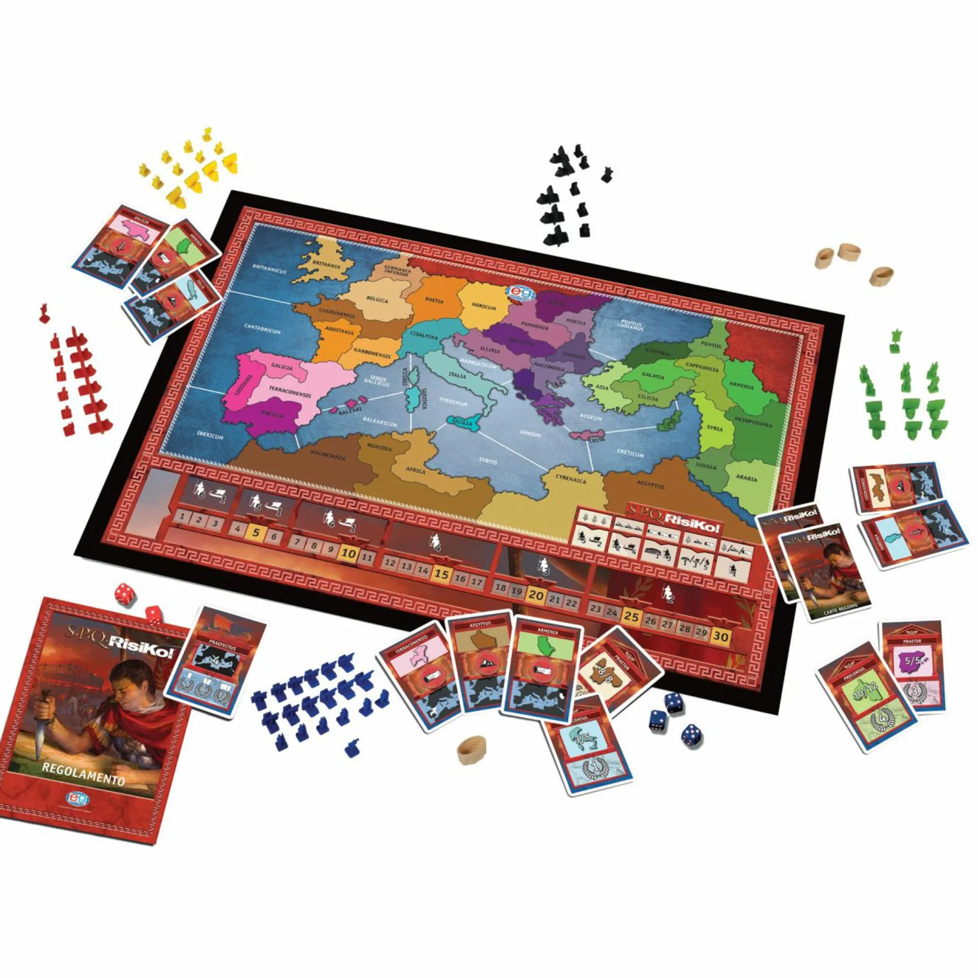 Una nuova versione di SPQRisiKo! più moderna e strategica. Nello scenario dell’antico Impero Romano, i giocatori vestono i panni di ambiziosi generali romani e lottano per l’egemonia. Solo chi saprà amministrare al meglio il proprio esercito diventerà Imperatore del nuovo Impero. La Plancia raffigura il l’Impero Romano con 45 Regioni raggruppate in 6 province e 12 Regioni di Mare. Sulla plancia c’è un’apposito tracciato segnapunti e una sezione riassunto fase di Rinforzi. Le armate sono composte da miniature in 5 colori a forma di Legionari, Stendardi e Triremi. I centri di potere sono rappresentati da minature a forma di Arena/Metropoli. Da 2 a 5 giocatori.
